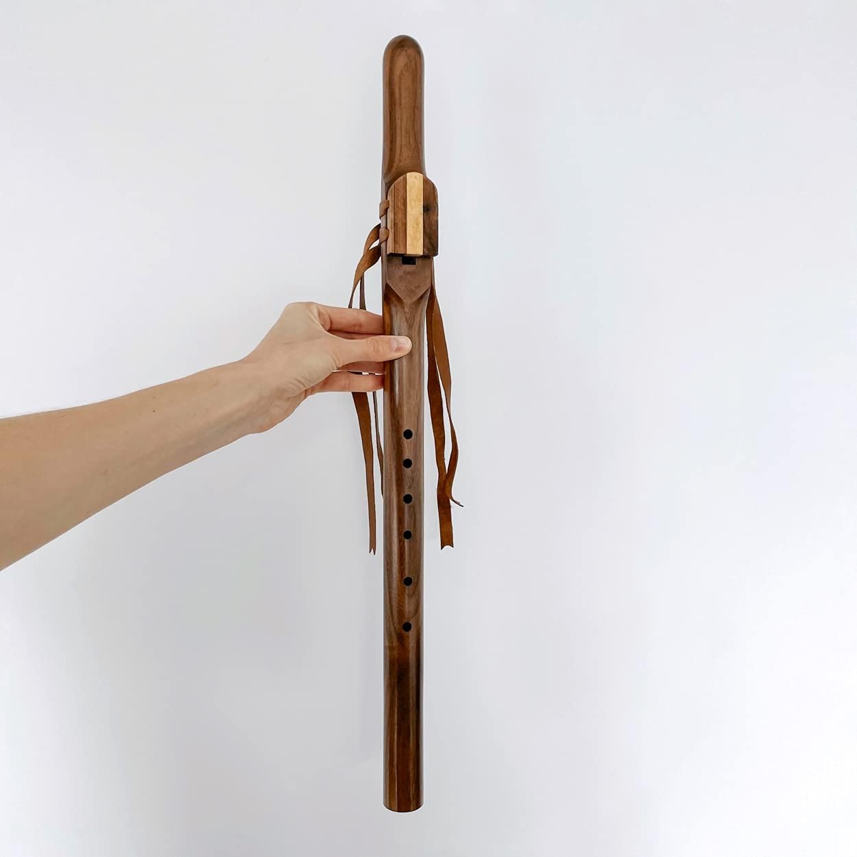 The 432Hz Walnut Flute in a key of F# creates a deep tone and is tuned to 432 Hz healing frequency. Warm notes and clear highs, this wooden flute is associated with the Anahata - Heart Chakra. It plays in the Native American scale as a 6- or 5-hole flute. The unique design of this 432 Hz bass flute is great for traveling, carrying around, and displaying at home as a piece of art. Wood: sustainable Walnut Features: wood-burned holes, superb breath control, very limited stock Key: F#, healing frequency of 432 Hz Handmade by a professional music teacher from a Turkish village Due to the handmade nature of these flutes, please allow slight variations in measurements and color.