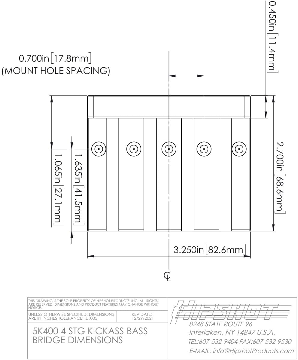 Lovingly dedicated to the granddaddy of high mass bridges, Hipshot is proud to offer the KickAss Bass Bridge. They spent years plus countless versions ensuring that this 'tribute' would possess the soul of the original without being a copy. The KickAss features the following: Unique saddle design features pre notched inserts (no filing required). These inserts allow you to easily adjust your string spacing from a narrow .687" (17.5mm) to a wide .800" (20mm) and anywhere in between! Comes standard with brass saddle inserts which emphasize the fundamental tone and give your bass a mellow sound. Also included are two extra inserts for greater range of height adjustment. The KickAss mounts on a typical 5 hole bass configuration and features recessed string ball holes for a sleeker look. All mounting hardware included.