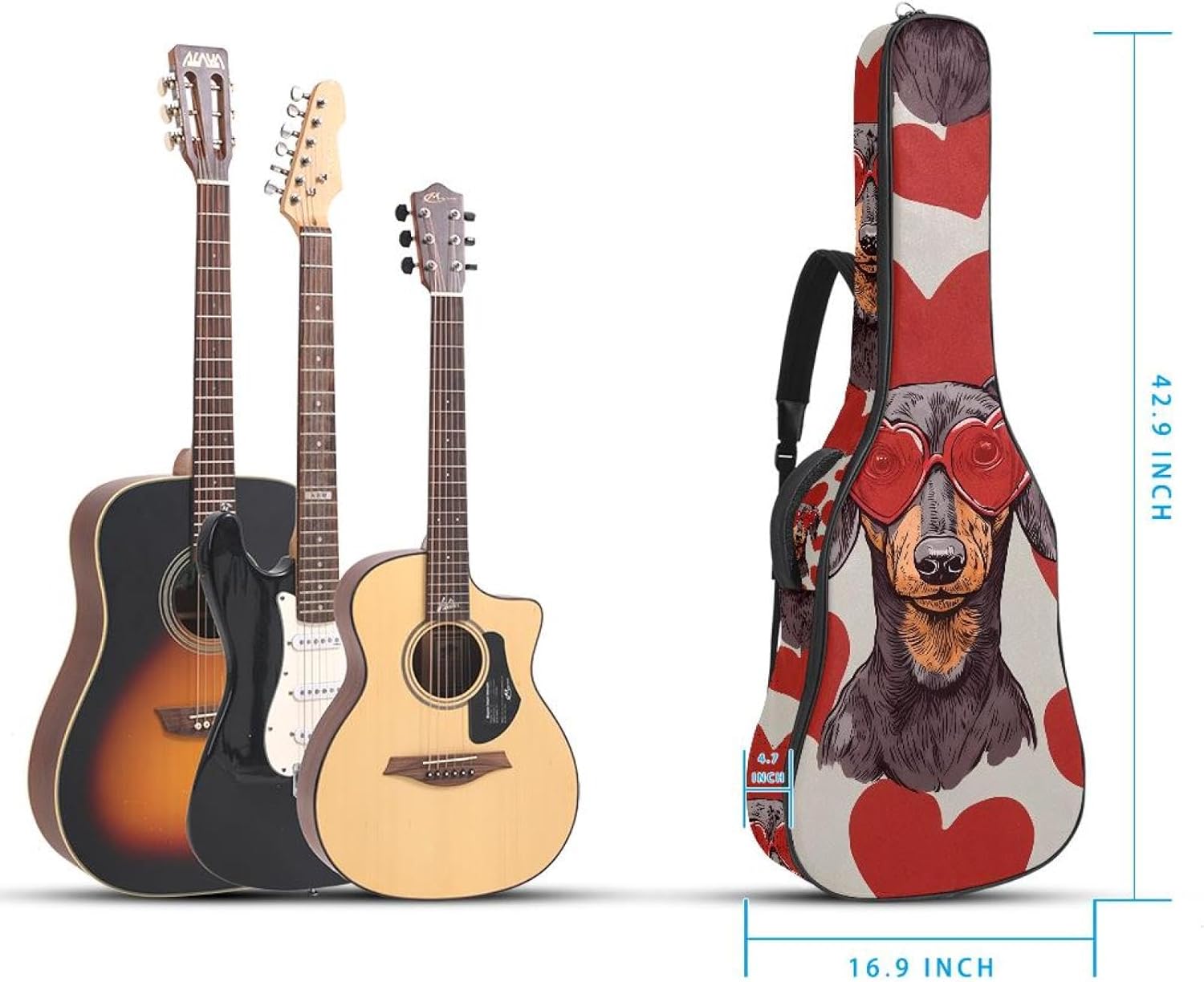 Give your valuable guitar the premium protection it deserves. Our Cute Printed Guitar Gig Bag is engineered for the modern musician who demands both security and convenience. Whether you're heading to a gig, a practice session, or on a short trip, this bag ensures your instrument arrives in perfect condition, ready to play.Constructed from durable, waterproof Oxford cloth, this bag stands up to the elements and the test of time. The interior is a sanctuary for your guitar, featuring ultra-thick padded sidewalls and a soft, anti-scratch lining that cradles your instrument, preventing scratches and damage. The heavy-duty rubber base acts as a shield against everyday bumps and allows for stable placement on any surface.Organization is effortless with multiple dedicated compartments. Two main storage pockets keep all your essential accessories—like a foldable music stand, tuner, picks, cables, and extra strings—neatly sorted and easily accessible. Never fumble for your tablet or sheet music again; the specially designed back pocket keeps them safe and separate.For a perfect, secure fit, the adjustable neck support and internal Velcro strap ensure your guitar does not shift around inside the bag, providing peace of mind with every carry.Care Instructions: To preserve the quality and appearance of your gig bag, please do not machine wash. Simply wipe clean with a damp cloth to remove any dirt or stains.