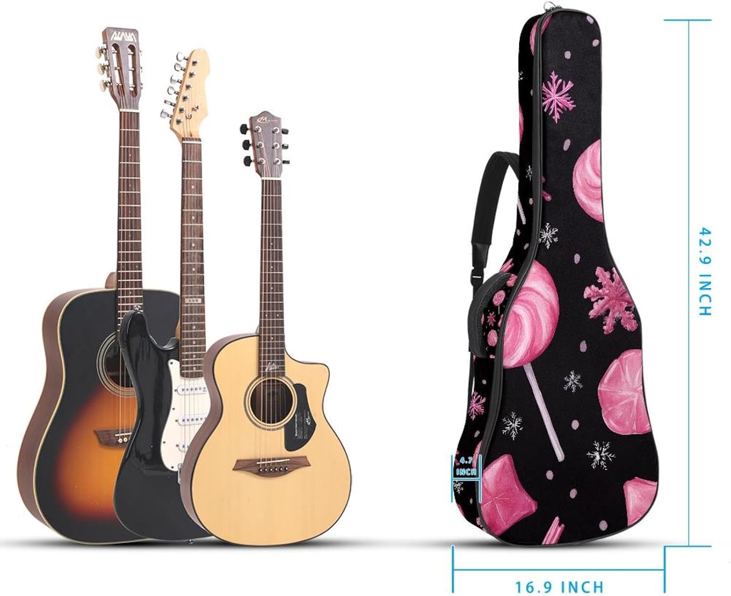 Give your valuable guitar the premium protection it deserves. Our Cute Printed Guitar Gig Bag is engineered for the modern musician who demands both security and convenience. Whether you're heading to a gig, a practice session, or on a short trip, this bag ensures your instrument arrives in perfect condition, ready to play.Constructed from durable, waterproof Oxford cloth, this bag stands up to the elements and the test of time. The interior is a sanctuary for your guitar, featuring ultra-thick padded sidewalls and a soft, anti-scratch lining that cradles your instrument, preventing scratches and damage. The heavy-duty rubber base acts as a shield against everyday bumps and allows for stable placement on any surface.Organization is effortless with multiple dedicated compartments. Two main storage pockets keep all your essential accessories—like a foldable music stand, tuner, picks, cables, and extra strings—neatly sorted and easily accessible. Never fumble for your tablet or sheet music again; the specially designed back pocket keeps them safe and separate.For a perfect, secure fit, the adjustable neck support and internal Velcro strap ensure your guitar does not shift around inside the bag, providing peace of mind with every carry.Care Instructions: To preserve the quality and appearance of your gig bag, please do not machine wash. Simply wipe clean with a damp cloth to remove any dirt or stains.