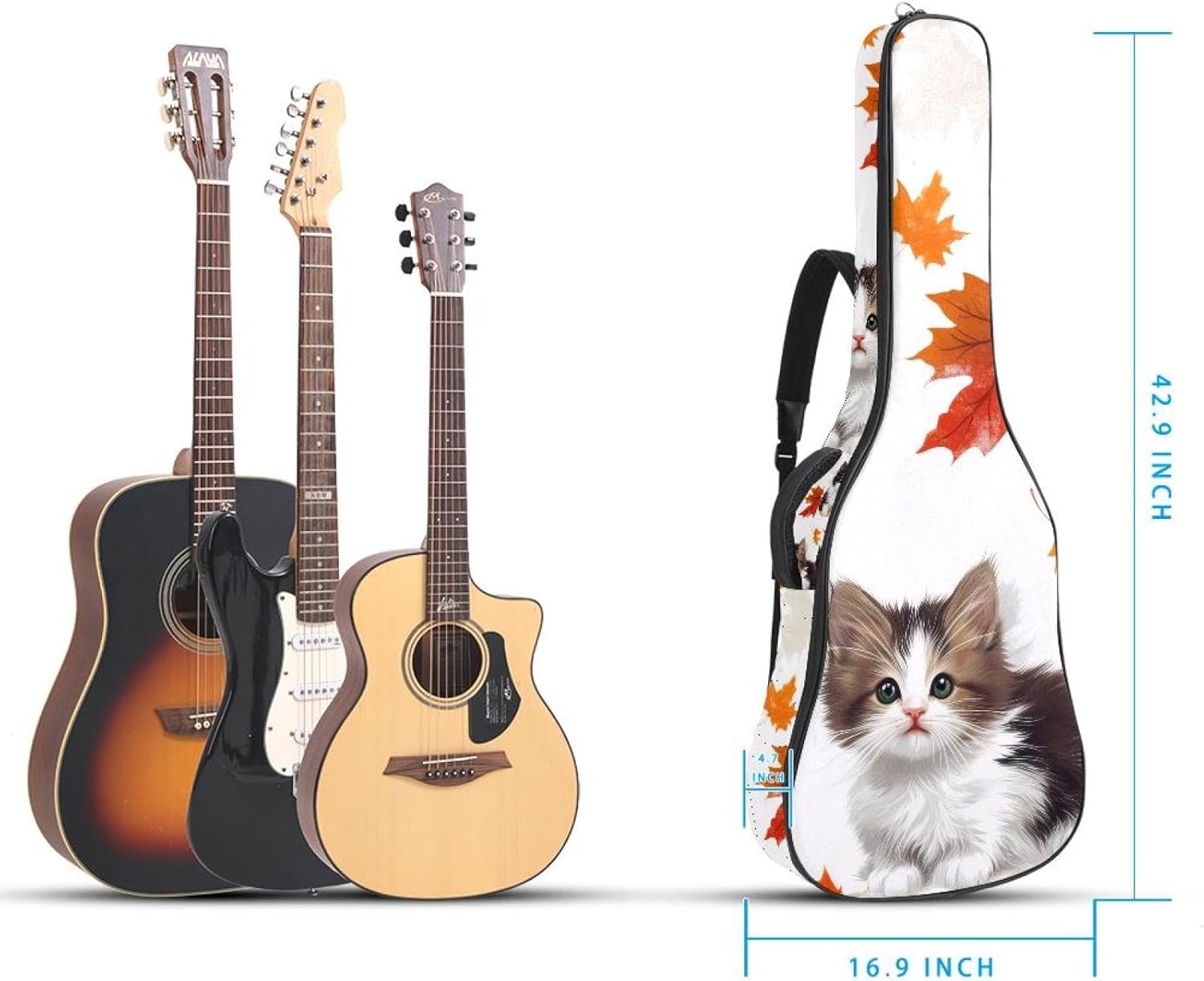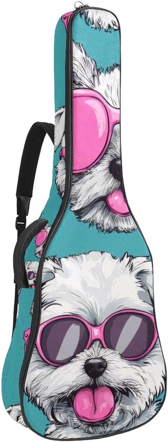 Give your valuable guitar the premium protection it deserves. Our Cute Printed Guitar Gig Bag is engineered for the modern musician who demands both security and convenience. Whether you're heading to a gig, a practice session, or on a short trip, this bag ensures your instrument arrives in perfect condition, ready to play.Constructed from durable, waterproof Oxford cloth, this bag stands up to the elements and the test of time. The interior is a sanctuary for your guitar, featuring ultra-thick padded sidewalls and a soft, anti-scratch lining that cradles your instrument, preventing scratches and damage. The heavy-duty rubber base acts as a shield against everyday bumps and allows for stable placement on any surface.Organization is effortless with multiple dedicated compartments. Two main storage pockets keep all your essential accessories—like a foldable music stand, tuner, picks, cables, and extra strings—neatly sorted and easily accessible. Never fumble for your tablet or sheet music again; the specially designed back pocket keeps them safe and separate.For a perfect, secure fit, the adjustable neck support and internal Velcro strap ensure your guitar does not shift around inside the bag, providing peace of mind with every carry.Care Instructions: To preserve the quality and appearance of your gig bag, please do not machine wash. Simply wipe clean with a damp cloth to remove any dirt or stains.