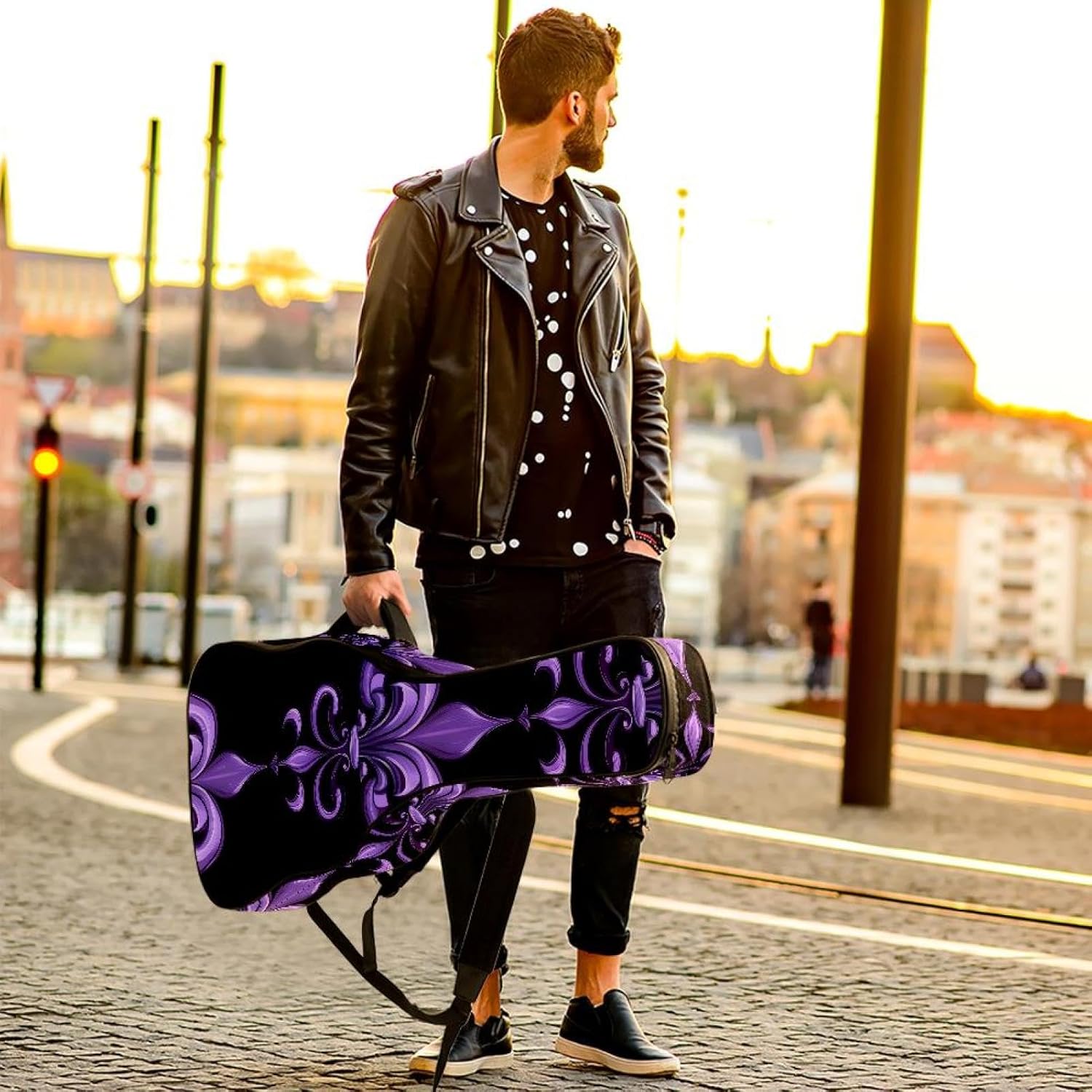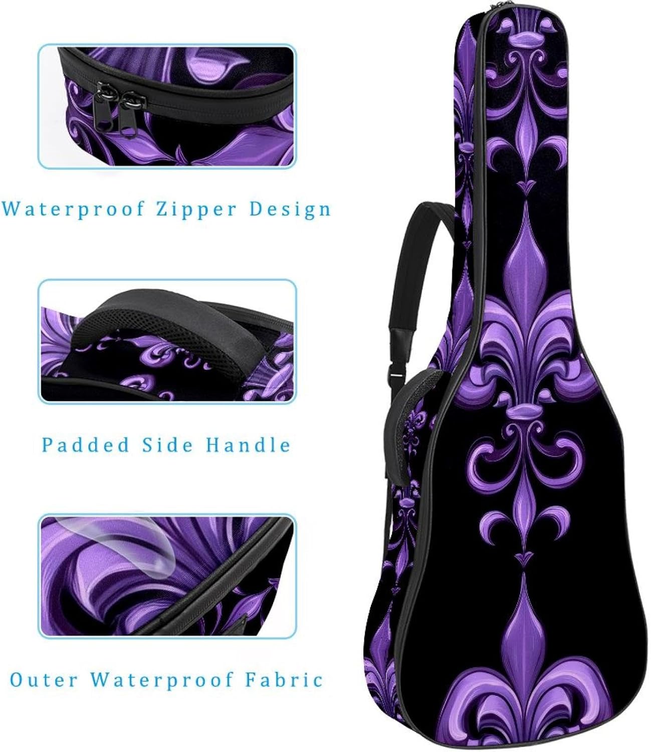 Give your valuable guitar the premium protection it deserves. Our Cute Printed Guitar Gig Bag is engineered for the modern musician who demands both security and convenience. Whether you're heading to a gig, a practice session, or on a short trip, this bag ensures your instrument arrives in perfect condition, ready to play.Constructed from durable, waterproof Oxford cloth, this bag stands up to the elements and the test of time. The interior is a sanctuary for your guitar, featuring ultra-thick padded sidewalls and a soft, anti-scratch lining that cradles your instrument, preventing scratches and damage. The heavy-duty rubber base acts as a shield against everyday bumps and allows for stable placement on any surface.Organization is effortless with multiple dedicated compartments. Two main storage pockets keep all your essential accessories—like a foldable music stand, tuner, picks, cables, and extra strings—neatly sorted and easily accessible. Never fumble for your tablet or sheet music again; the specially designed back pocket keeps them safe and separate.For a perfect, secure fit, the adjustable neck support and internal Velcro strap ensure your guitar does not shift around inside the bag, providing peace of mind with every carry.Care Instructions: To preserve the quality and appearance of your gig bag, please do not machine wash. Simply wipe clean with a damp cloth to remove any dirt or stains.