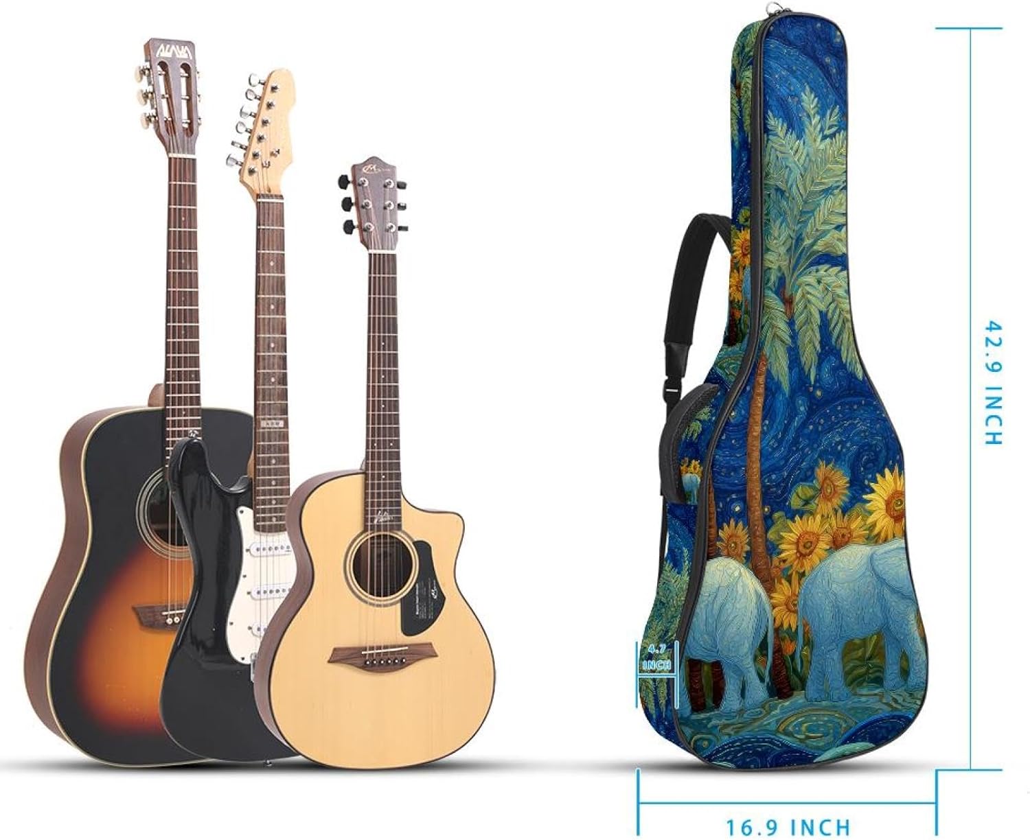 Give your valuable guitar the premium protection it deserves. Our Cute Printed Guitar Gig Bag is engineered for the modern musician who demands both security and convenience. Whether you're heading to a gig, a practice session, or on a short trip, this bag ensures your instrument arrives in perfect condition, ready to play.Constructed from durable, waterproof Oxford cloth, this bag stands up to the elements and the test of time. The interior is a sanctuary for your guitar, featuring ultra-thick padded sidewalls and a soft, anti-scratch lining that cradles your instrument, preventing scratches and damage. The heavy-duty rubber base acts as a shield against everyday bumps and allows for stable placement on any surface.Organization is effortless with multiple dedicated compartments. Two main storage pockets keep all your essential accessories—like a foldable music stand, tuner, picks, cables, and extra strings—neatly sorted and easily accessible. Never fumble for your tablet or sheet music again; the specially designed back pocket keeps them safe and separate.For a perfect, secure fit, the adjustable neck support and internal Velcro strap ensure your guitar does not shift around inside the bag, providing peace of mind with every carry.Care Instructions: To preserve the quality and appearance of your gig bag, please do not machine wash. Simply wipe clean with a damp cloth to remove any dirt or stains.