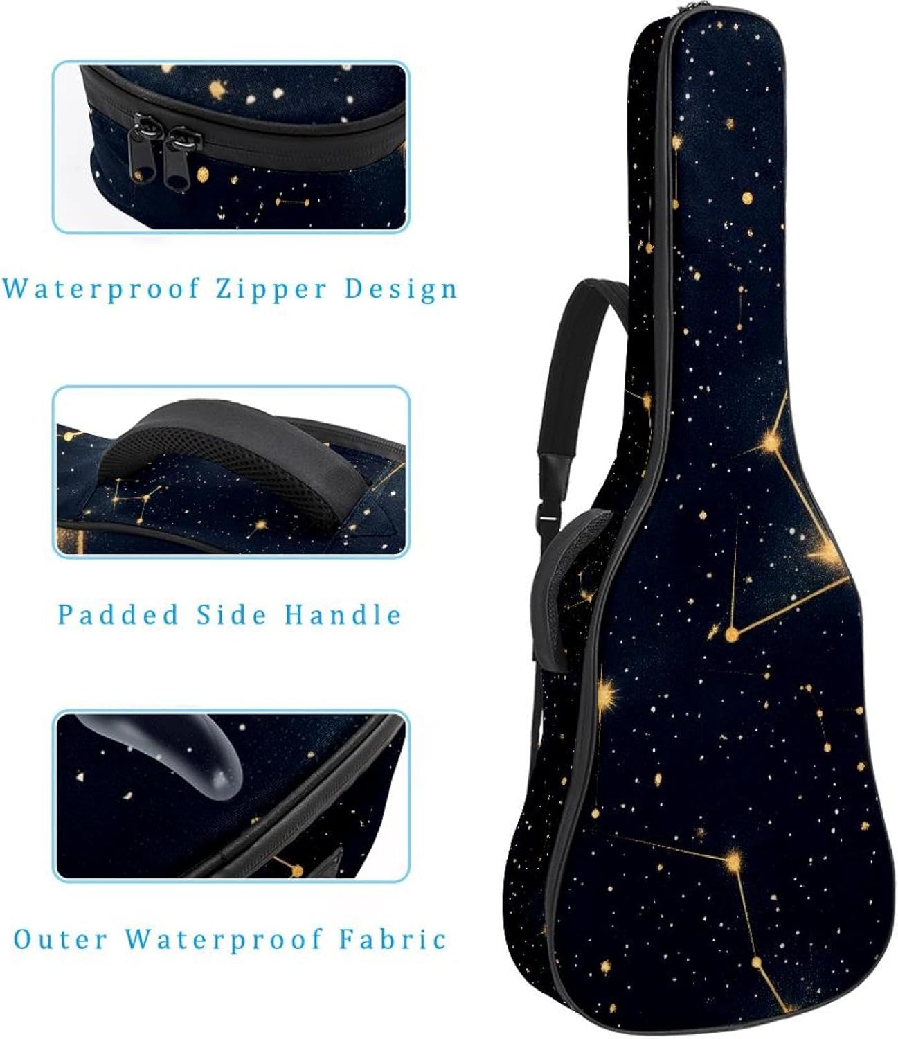 Give your valuable guitar the premium protection it deserves. Our Cute Printed Guitar Gig Bag is engineered for the modern musician who demands both security and convenience. Whether you're heading to a gig, a practice session, or on a short trip, this bag ensures your instrument arrives in perfect condition, ready to play.Constructed from durable, waterproof Oxford cloth, this bag stands up to the elements and the test of time. The interior is a sanctuary for your guitar, featuring ultra-thick padded sidewalls and a soft, anti-scratch lining that cradles your instrument, preventing scratches and damage. The heavy-duty rubber base acts as a shield against everyday bumps and allows for stable placement on any surface.Organization is effortless with multiple dedicated compartments. Two main storage pockets keep all your essential accessories—like a foldable music stand, tuner, picks, cables, and extra strings—neatly sorted and easily accessible. Never fumble for your tablet or sheet music again; the specially designed back pocket keeps them safe and separate.For a perfect, secure fit, the adjustable neck support and internal Velcro strap ensure your guitar does not shift around inside the bag, providing peace of mind with every carry.Care Instructions: To preserve the quality and appearance of your gig bag, please do not machine wash. Simply wipe clean with a damp cloth to remove any dirt or stains.