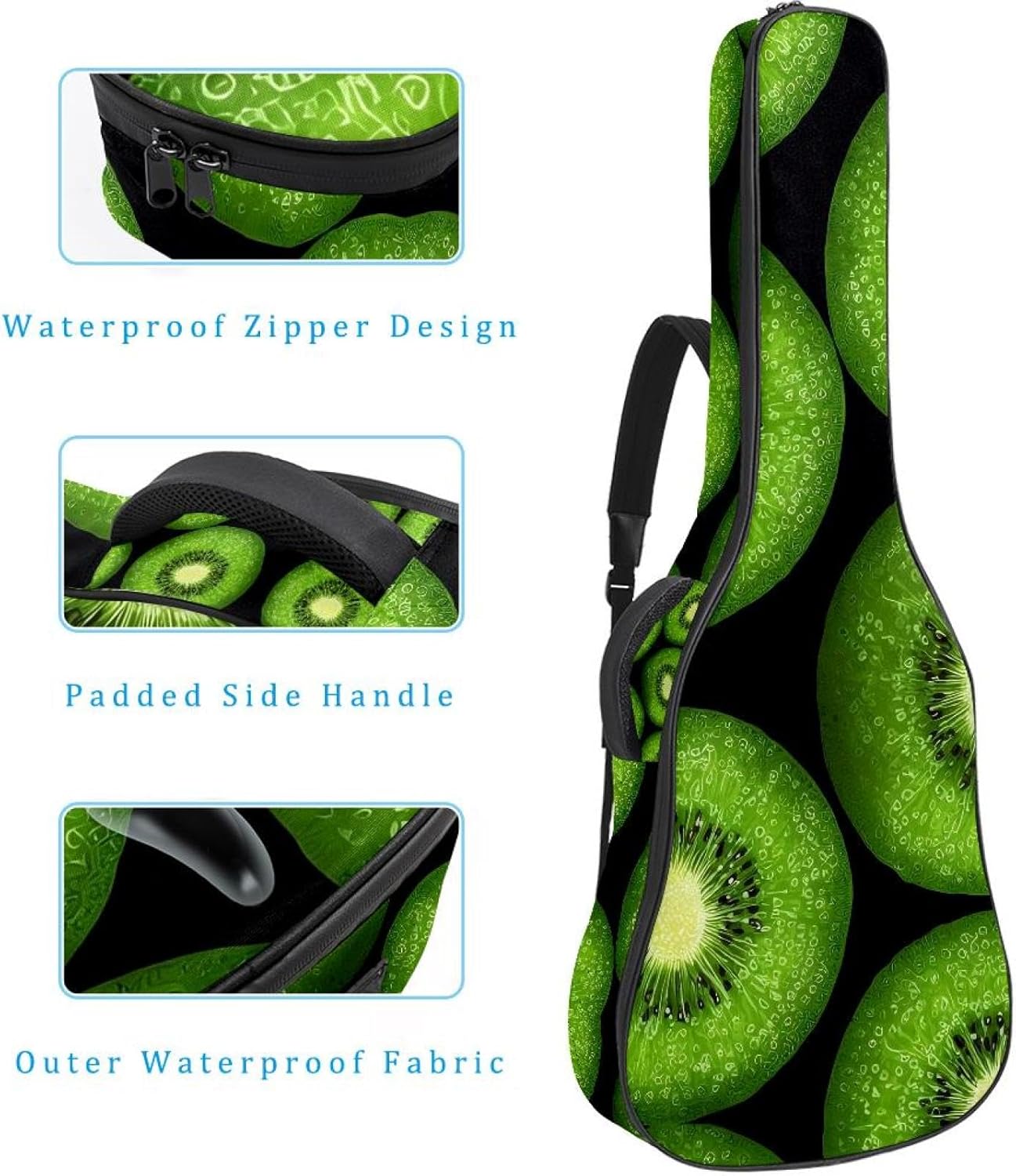 Give your valuable guitar the premium protection it deserves. Our Cute Printed Guitar Gig Bag is engineered for the modern musician who demands both security and convenience. Whether you're heading to a gig, a practice session, or on a short trip, this bag ensures your instrument arrives in perfect condition, ready to play.Constructed from durable, waterproof Oxford cloth, this bag stands up to the elements and the test of time. The interior is a sanctuary for your guitar, featuring ultra-thick padded sidewalls and a soft, anti-scratch lining that cradles your instrument, preventing scratches and damage. The heavy-duty rubber base acts as a shield against everyday bumps and allows for stable placement on any surface.Organization is effortless with multiple dedicated compartments. Two main storage pockets keep all your essential accessories—like a foldable music stand, tuner, picks, cables, and extra strings—neatly sorted and easily accessible. Never fumble for your tablet or sheet music again; the specially designed back pocket keeps them safe and separate.For a perfect, secure fit, the adjustable neck support and internal Velcro strap ensure your guitar does not shift around inside the bag, providing peace of mind with every carry.Care Instructions: To preserve the quality and appearance of your gig bag, please do not machine wash. Simply wipe clean with a damp cloth to remove any dirt or stains.