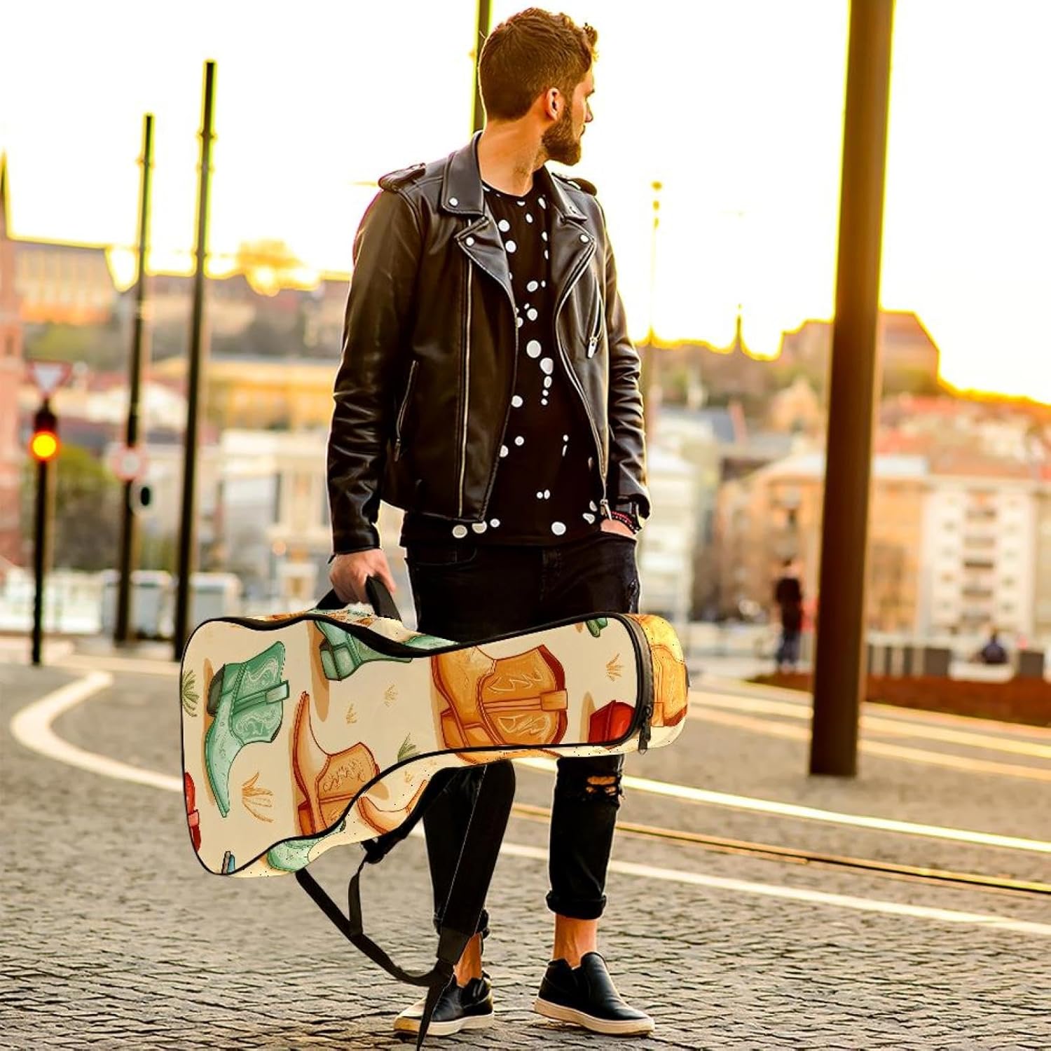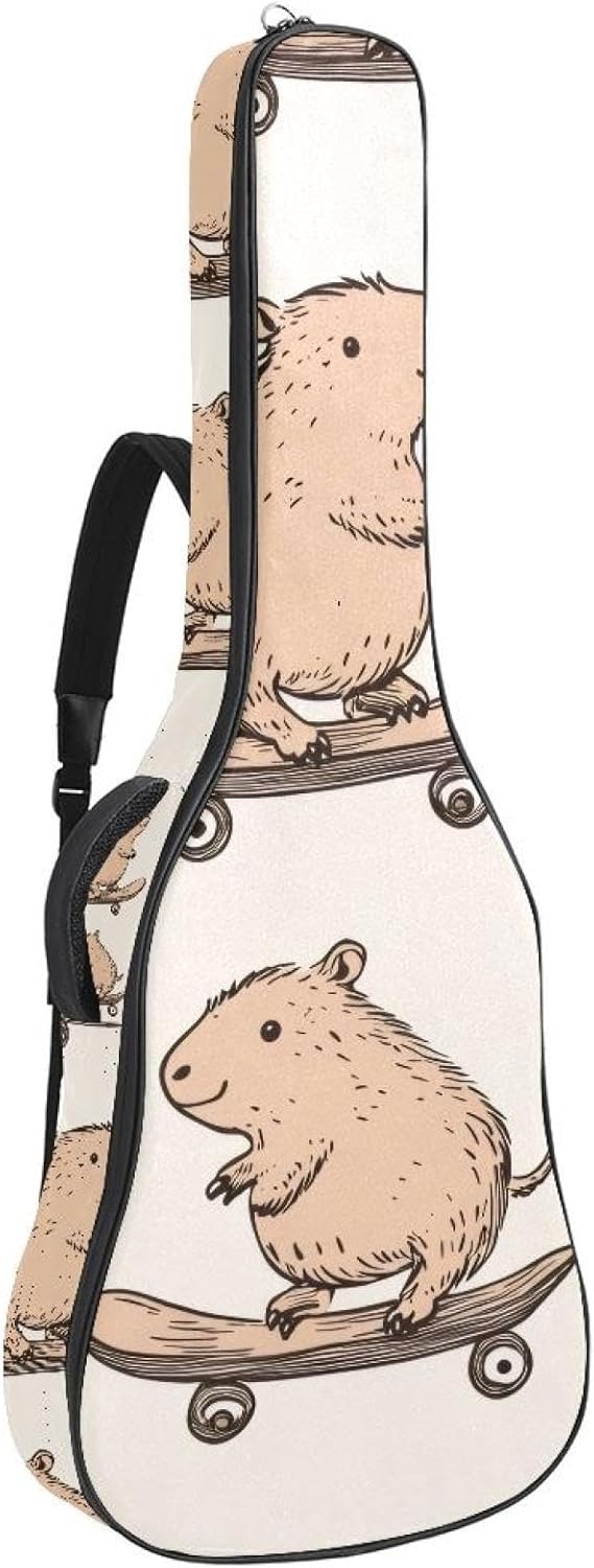 Give your valuable guitar the premium protection it deserves. Our Cute Printed Guitar Gig Bag is engineered for the modern musician who demands both security and convenience. Whether you're heading to a gig, a practice session, or on a short trip, this bag ensures your instrument arrives in perfect condition, ready to play.Constructed from durable, waterproof Oxford cloth, this bag stands up to the elements and the test of time. The interior is a sanctuary for your guitar, featuring ultra-thick padded sidewalls and a soft, anti-scratch lining that cradles your instrument, preventing scratches and damage. The heavy-duty rubber base acts as a shield against everyday bumps and allows for stable placement on any surface.Organization is effortless with multiple dedicated compartments. Two main storage pockets keep all your essential accessories—like a foldable music stand, tuner, picks, cables, and extra strings—neatly sorted and easily accessible. Never fumble for your tablet or sheet music again; the specially designed back pocket keeps them safe and separate.For a perfect, secure fit, the adjustable neck support and internal Velcro strap ensure your guitar does not shift around inside the bag, providing peace of mind with every carry.Care Instructions: To preserve the quality and appearance of your gig bag, please do not machine wash. Simply wipe clean with a damp cloth to remove any dirt or stains.