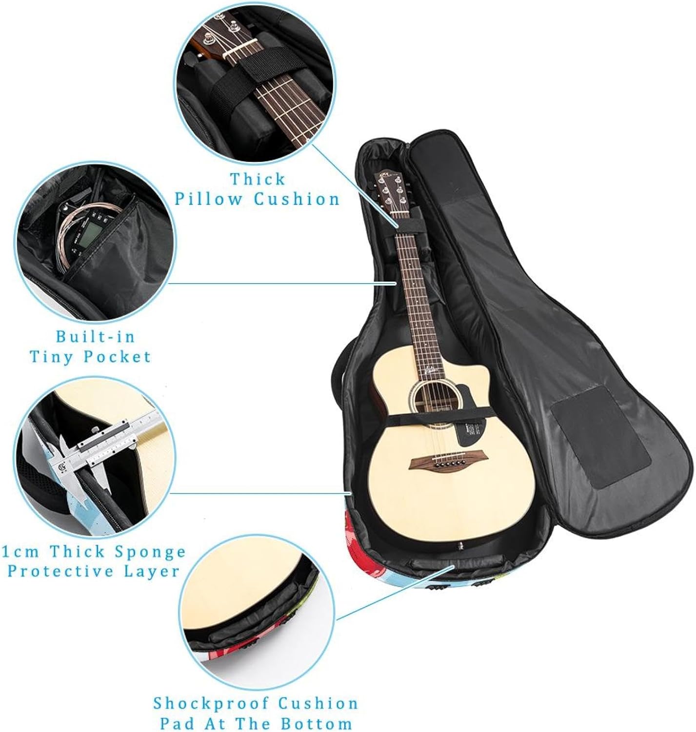 Give your valuable guitar the premium protection it deserves. Our Cute Printed Guitar Gig Bag is engineered for the modern musician who demands both security and convenience. Whether you're heading to a gig, a practice session, or on a short trip, this bag ensures your instrument arrives in perfect condition, ready to play.Constructed from durable, waterproof Oxford cloth, this bag stands up to the elements and the test of time. The interior is a sanctuary for your guitar, featuring ultra-thick padded sidewalls and a soft, anti-scratch lining that cradles your instrument, preventing scratches and damage. The heavy-duty rubber base acts as a shield against everyday bumps and allows for stable placement on any surface.Organization is effortless with multiple dedicated compartments. Two main storage pockets keep all your essential accessories—like a foldable music stand, tuner, picks, cables, and extra strings—neatly sorted and easily accessible. Never fumble for your tablet or sheet music again; the specially designed back pocket keeps them safe and separate.For a perfect, secure fit, the adjustable neck support and internal Velcro strap ensure your guitar does not shift around inside the bag, providing peace of mind with every carry.Care Instructions: To preserve the quality and appearance of your gig bag, please do not machine wash. Simply wipe clean with a damp cloth to remove any dirt or stains.