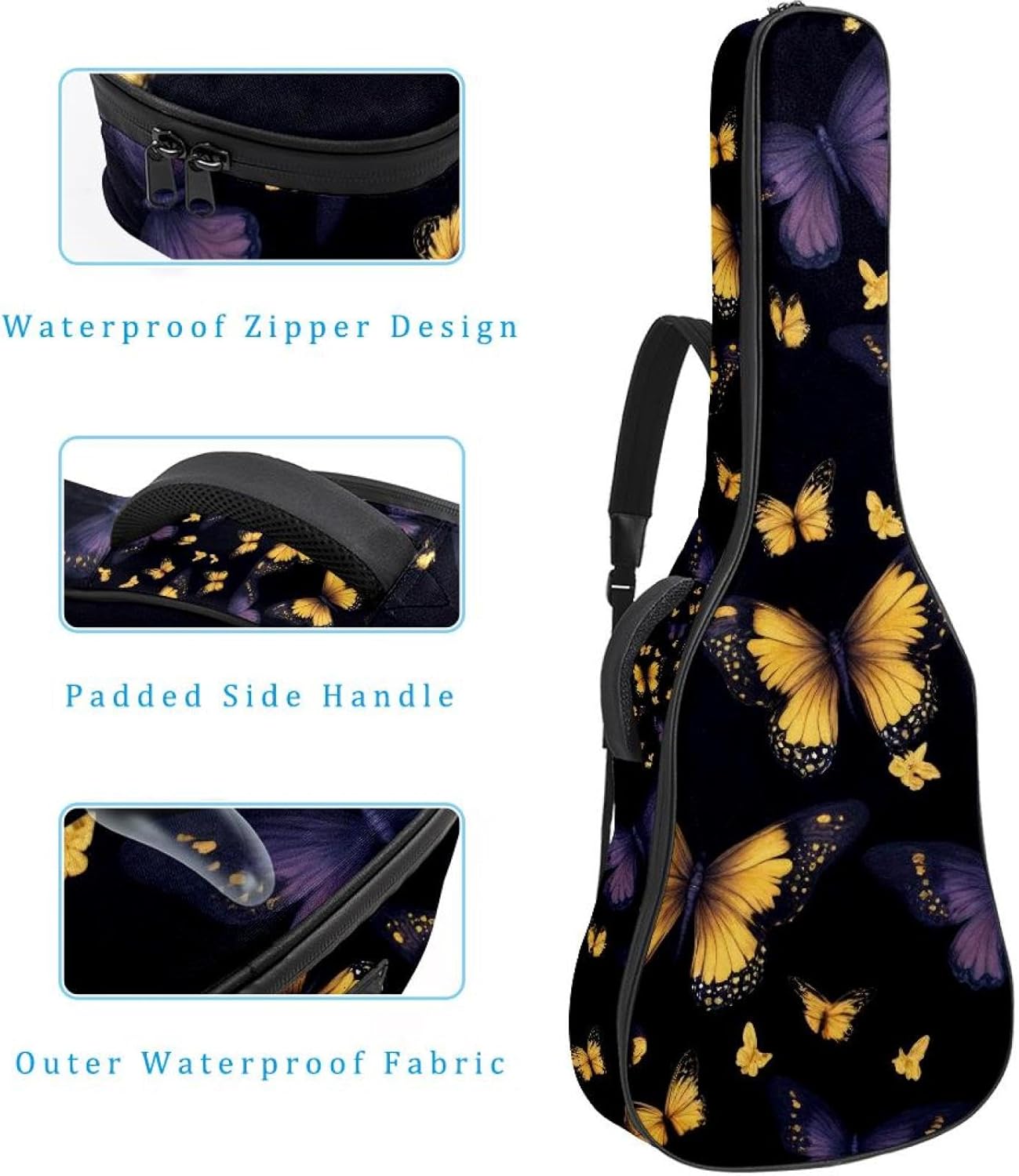 Give your valuable guitar the premium protection it deserves. Our Cute Printed Guitar Gig Bag is engineered for the modern musician who demands both security and convenience. Whether you're heading to a gig, a practice session, or on a short trip, this bag ensures your instrument arrives in perfect condition, ready to play.Constructed from durable, waterproof Oxford cloth, this bag stands up to the elements and the test of time. The interior is a sanctuary for your guitar, featuring ultra-thick padded sidewalls and a soft, anti-scratch lining that cradles your instrument, preventing scratches and damage. The heavy-duty rubber base acts as a shield against everyday bumps and allows for stable placement on any surface.Organization is effortless with multiple dedicated compartments. Two main storage pockets keep all your essential accessories—like a foldable music stand, tuner, picks, cables, and extra strings—neatly sorted and easily accessible. Never fumble for your tablet or sheet music again; the specially designed back pocket keeps them safe and separate.For a perfect, secure fit, the adjustable neck support and internal Velcro strap ensure your guitar does not shift around inside the bag, providing peace of mind with every carry.Care Instructions: To preserve the quality and appearance of your gig bag, please do not machine wash. Simply wipe clean with a damp cloth to remove any dirt or stains.