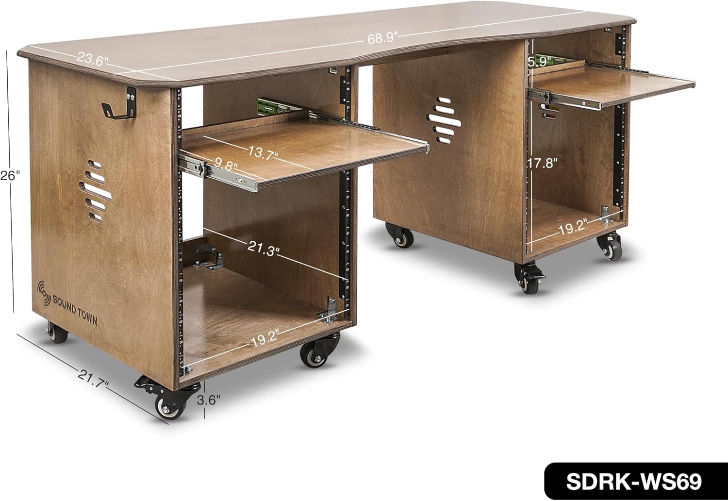 Sound Town DIY Music Studio Rack Desk Workstation with 2 X 13U Side Cabinets, Two Slide-Out Trays, Casters, Plywood, Weathered Brown for Recording Room, Home Studio (SDRK-WS69)The Sound Town SDRK-WS69 Studio Rack Desk is designed to provide a spacious and organized workspace for home recording, podcasting, gaming, video editing, streaming, and other creative or professional applications. With a large 68.9" x 23.6" surface, this desk ensures ample room for your equipment, keeping everything easily accessible for a seamless workflow.For optimal storage, the SDRK-WS69 features dual 13U side cabinets (19" width) equipped with slide-out trays—a 3U top section and 10U lower section—allowing you to neatly organize your rack-mounted gear and essential accessories. Built-in headphone hooks on both sides offer a convenient way to store and access your headphones while keeping your workspace clutter-free. Constructed from high-quality 15mm (0.59") Baltic birch plywood, this desk is built for durability and long-term stability, making it an excellent choice for both home and professional studio setups. The Weathered Brown finish adds a sophisticated touch, blending seamlessly into any studio, office, or gaming environment.Designed for both mobility and stability, each cabinet is fitted with four smooth-rolling casters, two of which feature lever brakes to lock the desk securely in place when needed. For those preferring a stationary setup, non-slip rubber feet provide added stability. Assembly is quick and hassle-free, thanks to the included user manual that provides clear, step-by-step instructions.Whether you're setting up a studio, enhancing your gaming station, or creating a more efficient workspace, the Sound Town SDRK-WS69 Studio Desk delivers the perfect balance of functionality, style, and durability to support your creative and professional needs.