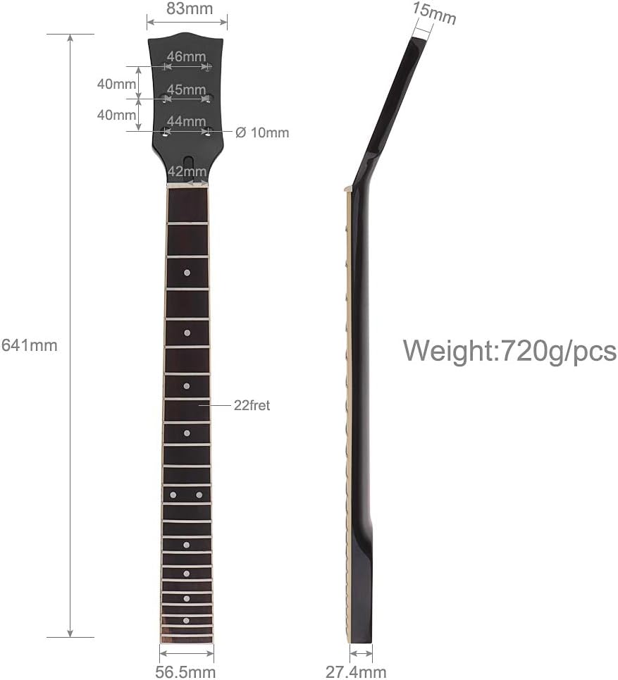 Electric Guitar Neck Features: -item 100% like the picture shown -Black Gloss neck. -Fits Gibson / Epiphone Les Paul Junior / SG Neck replacement. -Neck Wood: Maple -Fretboard Wood: Rosewood with Binding. -Side dots: Black---Side dots on both sides of the neck, so you can use it as either right or left handed neck. -With white Trapezoid dots inlay. -Scale Length: 24-3/4"" -Tuner Hole Size: 11/32"" - for vintage style tuners; -Width at Nut: 1-5/8""(Pre-cutted right-handed nut installed, you have to replace it if you plan to make this neck for lefty version); -Width at Heel: 2-1/4"" -Frets: 22 Heavy Jumbo Nickel/Silver Frets (Size: .103"" x .046"") -Truss Rod Adjust: at Headstock -Package include: 1 x black guitar neck