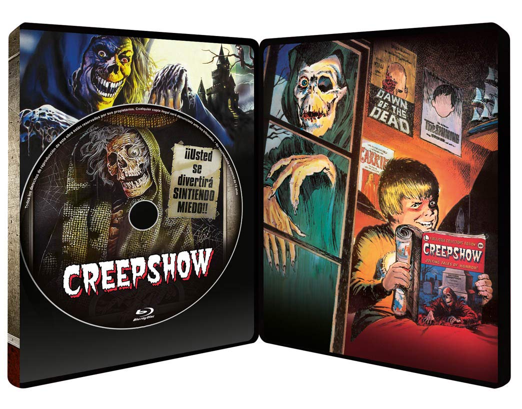 Spain released, Blu-Ray/Region A/B/C : it WILL NOT play on regular DVD player. You need Blu-Ray DVD player to view this Blu-Ray DVD: LANGUAGES: English ( DTS 5.1 ), English ( DTS-HD Master Audio ), Spanish ( Dolby Digital 2.0 ), Spanish ( DTS-HD Master Audio ), English ( Subtitles ), Spanish ( Subtitles ), WIDESCREEN (1.85:1), SPECIAL FEATURES: Behind the scenes, Deleted Scenes, Interactive Menu, Photo Gallery, Posters, Scene Access, Special Edition, Steelbook Edition, Trailer(s), SYNOPSIS: Five tales of terror are presented. The first deals with a demented old man returning from the grave to get the Father's Day cake his murdering daughter never gave him. The second is about a not-too-bright farmer discovering a meteor that turns everything into plant-life. The third is about a vengeful husband burying his wife and her lover up to their necks on the beach. The fourth is about a creature that resides in a crate under the steps of a college. The final story is about an ultra-rich businessman who gets his comeuppance from cockroaches. ...Creepshow (Steelbook Edition)