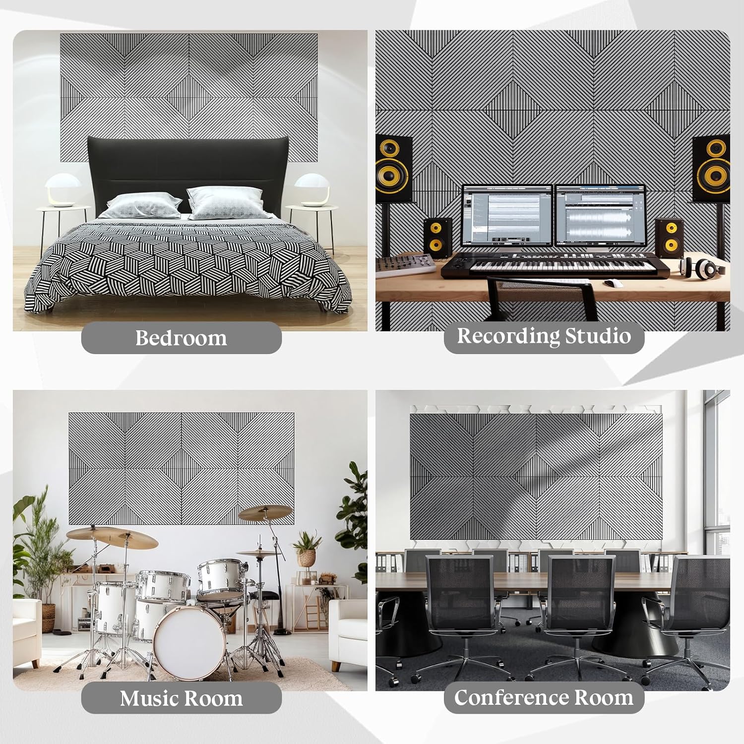 Features: All-in-One acoustic solution: Achieve a professional acoustic treatment without the complexity. Our soundproof wall panels combine sound absorption and modern design in one ready-to-install product, saving you time and effort. Versatile for any space: Beyond studios and home theaters, use these adhesive wall panels to enhance privacy in offices, reduce noise in bedrooms, or simply add an artistic touch to your living area. Specifications: Material: high-density polyester fiber Color: black and white Size: approx. 23.6 x 23.6 inches/ 60 x 60 cm Package includes: 6 x Large Acoustical Wall Panels Notes: Manual measurement, please allow slight errors on size. The color may exist a slight difference due to different screen displays. Our products have strong adhesive, please do not stick them on the paper cabinet, paint cabinet, in case of damage to the furniture