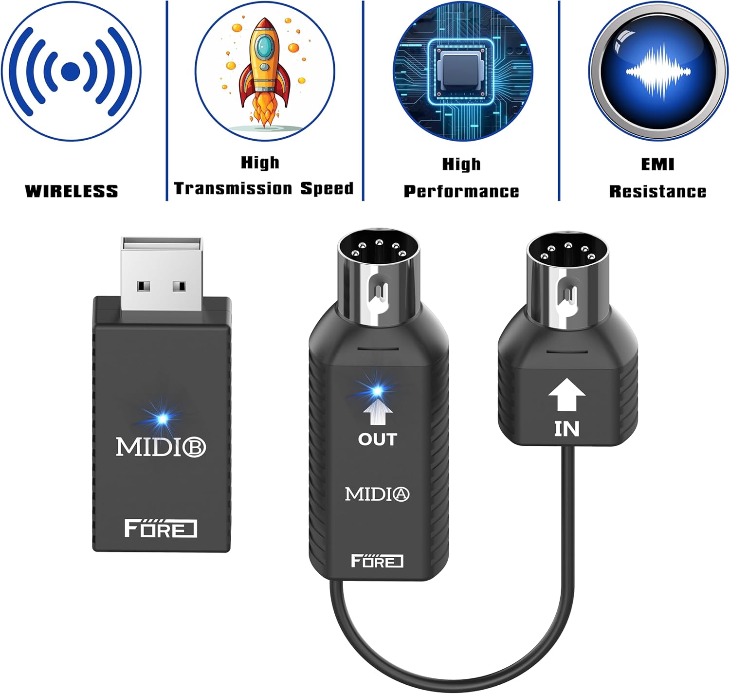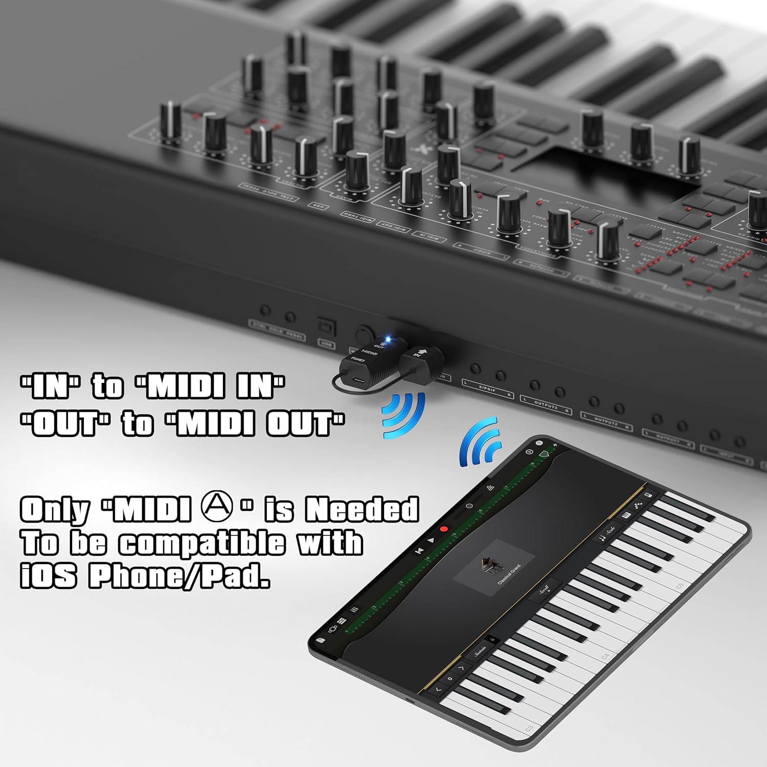 | Compatible Devices | Any MIDI Device with 5-PIN DIN MIDI Port. Compatible with iOS & Android Phone/Pad, mac OS and Windows System., MIDI Keyboard, MIDI Keyboard Controller, MIDI Foot Controller, MIDI Analog Synthesizer, MIDI Sequencer, MIDI Audio interface Box, Audio Mixer, Auido Amplifier, External Sound Card, Electronic Piano, Electronic Drum Machine & DJ Sets. |