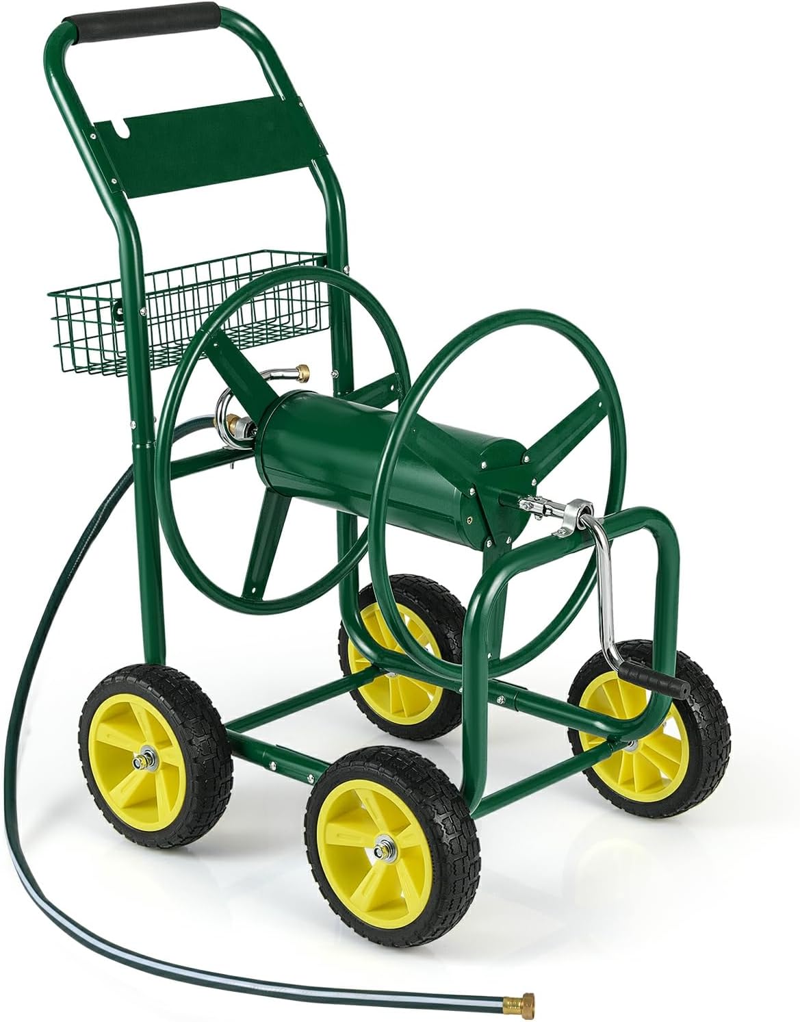Description: Make your gardening tasks seamless and efficient! Designed to hold up to 300 ft of 5/8” hose or 400 ft of 1/2” (90 m of 20 mm or 120 m of 15 mm) hose, this garden hose reel cart is perfect for large gardens. It includes a sturdy 6 ft (186 cm) 1” (25 mm) water inlet hose for extended reach and added convenience. Built for durability, it features brass fittings to prevent leaks and a heavy-duty metal frame that withstands daily use. Mobility is a breeze with four solid 10” tires and a foam-padded handle for easy transport over various terrains. The cart also comes with a labor-saving crank for quick hose winding and unwinding, plus a back storage basket for extra tools or supplies. Whether you’re watering lawns, washing cars, or bathing pets, this hose reel cart simplifies your watering tasks and is an essential tool for both personal and commercial landscaping projects. Features: Holds up to 300 ft of 5/8” hose or 400 ft of 1/2”, 90 m of 20 mm, or 120 m of 15 mm hose (hose not included) Ensures ample hose length to reach every corner of your garden or yard Large solid tires provide smooth, stable movement and resist wear for lasting reliability Foam-padded handrail offers a comfortable grip for easy maneuvering Brass fittings create a secure seal to prevent water leakage Quick and effortless hose rewinding—no more dragging heavy hoses around Heavy-duty metal frame is deformation-resistant and built to last Includes a storage basket to keep gardening tools within easy reach Convenient cutout design makes hose storage simple and tidy Ideal for watering plants, washing cars, and bathing pets Comes with a 6 ft (186 cm) 25 mm (1”) water inlet hose for easy faucet connection Specifications: Color: Silver/Blue/Green Material: Metal, Brass Product Dimensions: 27” x 25” x 45” (L x W x H) Tire Diameter: 10” Hose Capacity: 300 ft of 5/8” hose or 400 ft of 1/2”/90 m of 20 mm or 120 m of 15 mm hose Inlet Hose Length: 6 ft Net Weight: 37.5 lbs Package Includes: 1 x Garden Hose Reel Cart 1 x Inlet Hose 1 x User’s Manual