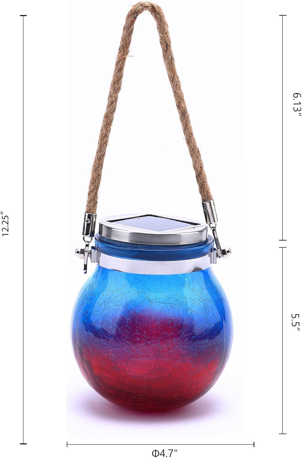 This outdoor hanging solar lantern can be hung outdoors on porches, trees, or courtyards, or used as a table centerpiece for outdoor entertaining. For everyday use or special occasions, this crackle glass solar powered lantern is a beautiful and easy decorative accent piece for your outdoor living space. The lovely crackle pattern on the glass globe allows the light to shine through creating a beautiful pattern to make your patio or garden decor look nicer, cozier and more inviting. The energy-saving solar powered lantern are convenient to use anywhere outdoors. Simply turn on, and allow the solar panel to charge in fully sun. When the lantern is switched on, it will automatically come on at night, and will stay on for 6-8 hours. The rope handle allows you to hang the globe shaped glass lantern from hooks, trees, or arbors. The water-resistant solar light ensures long-lasting performance under most weather conditions. This stylish lantern is the ideal choice for outdoor decorative lights.
