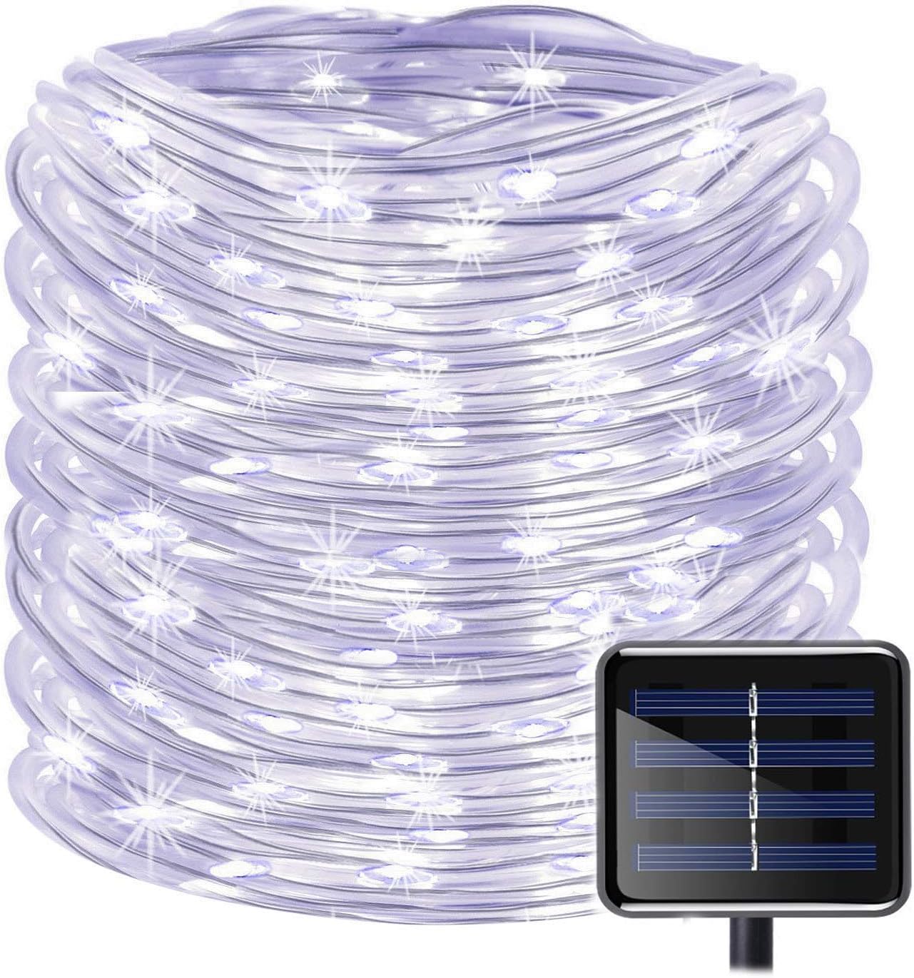 Specification: Protection Grade: IP65 LED Quantity: 200 pcs Lighting Mode: 8Modes,Constant ON / Flashing(7 flashing speed). Battery: built-in 1.2V 1800mAh NI-MH battery Solar panel:2V 300MA Materials: Copper wire + PVC tube Control method: Light-operated + Buttons Working Temperature:-20℃-60℃ Length of String: 72ft(22m ) Length from Solar panel to first stake: 6.56ft(2m) Length between two light: 0.33ft(0.1m) Product Weight: 600g Shipping Weight: 650g Package Dimension: 130*123*148mm Package Contents: 1 x 200 LED Solar Rope Lights 1 x Solar Panel Note: 1.In cloudy or rainy days, the battery cannot get sufficient power supply in daytime. It needs to be fully charged in a sunny day. 2.It is suggested the solar panel to be fully charged for 6h at the first use. 3.The light will light up automatically at dusk and may turn off automatically when ambient light is too strong(above 15lux). 4.Turn the light on and set light mode before charging the solar power, so it will light up at dusk.