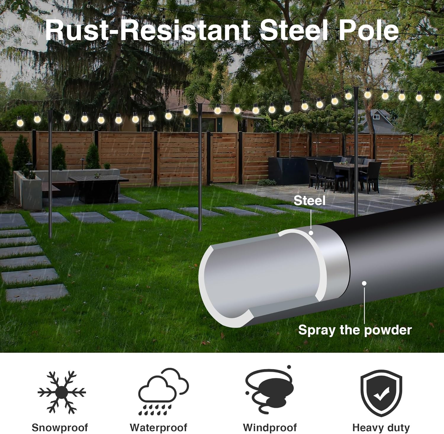 | Included Components | 6 black poles, 1 string light with 25 bulbs, 6 round bases, 6 4-prong bases, 1 remote control, and other accessories |