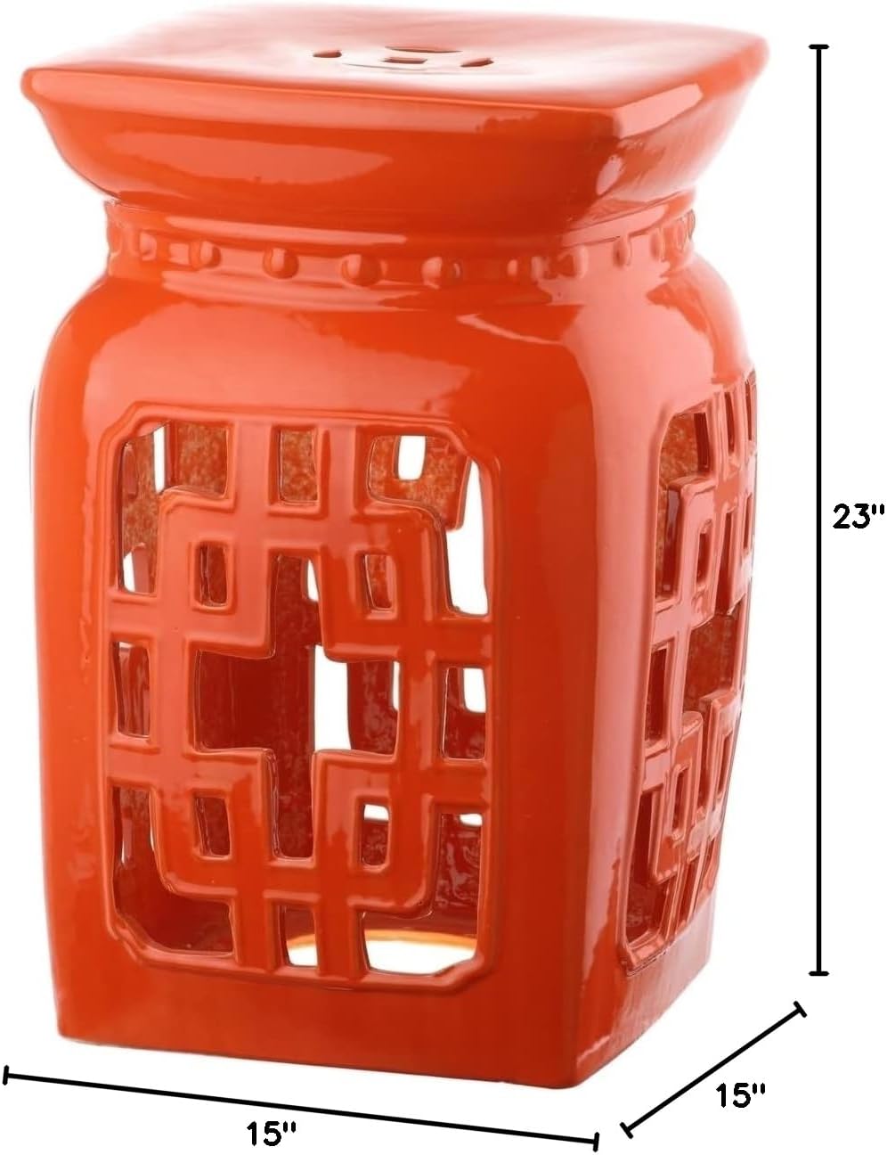 Classic Chinese fretwork inspired the transitional pierced motif of the bright orange Beijing Filigree indoor-outdoor garden stool. Designed for use as a seat or table, this artful glazed ceramic piece lends sophistication to any room, porch or patio.