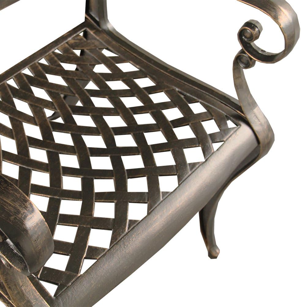 This floral rose outdoor dining chair will bring luxury & convenience to your patio, porch, deck, garden, pool deck, basically any outdoor space. Made from cast aluminum, this durable, high quality outdoor dining chair feature a mesh seat & backrest with rose ornate flower & floral details. The Bronze & black finish is neutral to match any outdoor furniture & will hold up in any weather condition. With such high quality durable aluminum material, you'll enjoy these chairs for years to come. Dimensions: chair: 24.45" D x 26.20" w x 35.45" H seat: 17.25" D x 19.25" w x 18.25" H