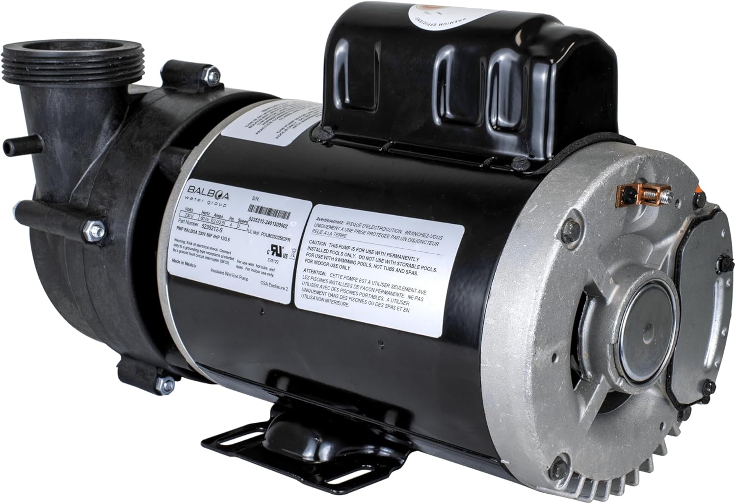 4 HP 2-Speed Spa Pump 240 volts Balboa Ultimax Niagara - 3450/1750 RPM, Frame 56, 16.4/4.1 Amp motor, 2 side discharge wet end. Can also be used as a 1-Speed 4 HP jet pump. Features High flow rates exceeding 325 gallons per minute for maximum performance in your luxury applications. All seals are carbon ceramic with Viton elastomers for long-lasting performance, easily enduring prolonged heat and chemical exposure. Multi-directional pump head mountings provide the flexibility to accommodate any configuration; Cool running 56 frame motor. The two-speed motor ensure sanitization and heating can occur while maintaining lower running costs. UL, TUV, CSA certified. This pumps is intended as a replacement for common true 4.0 HP 230 volt side discharge pumps that use 2 unions at both the suction and discharge connections. Safety features include auto motor overheat shut off protection. This pump is designed as a 2 speed pump but can also replace any single 1-speed 4 HP pump.Comes complete with two 2" replacement unions. Drain plug ensures no water is left in the pump body during storage, which is useful for hygienic reasons and also prevents freeze damage where applicable. Side Nipple for Ozone venturis.Features: Amps = 16.4/4.1 RPM = 3450/1750, FRAME = 56 (6.69 wide), Length = 15.82, Height = 8.83, Connection = 2, Manufacturer Warranty = 2 Years