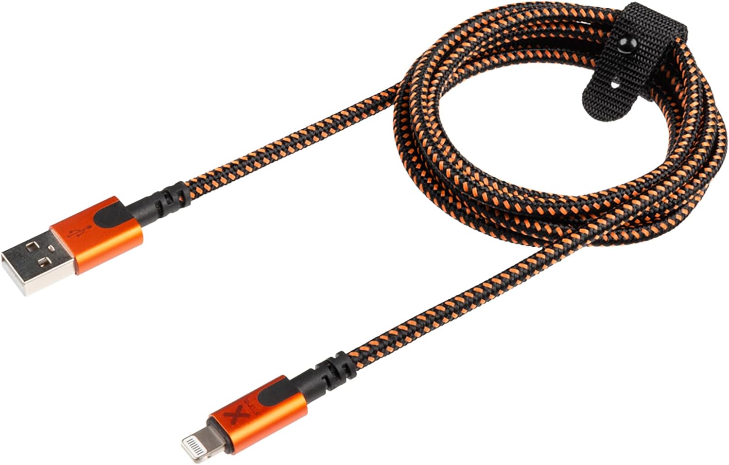 The ultra-strong Xtorm Xtreme Series USB-A to Lightning cable is built to last and offers a lifetime warranty. Every detail is designed to withstand the wear and tear caused by heavy use. It's able to withstand 100,000 bends, and is pull tested to support up to 220 lbs. (100 kg). The cable is made from a multi-layer composite material with a reinforced core that gives it extra strength and durability. Every detail of this cable is designed to be maximally rugged, even the included cable strap!