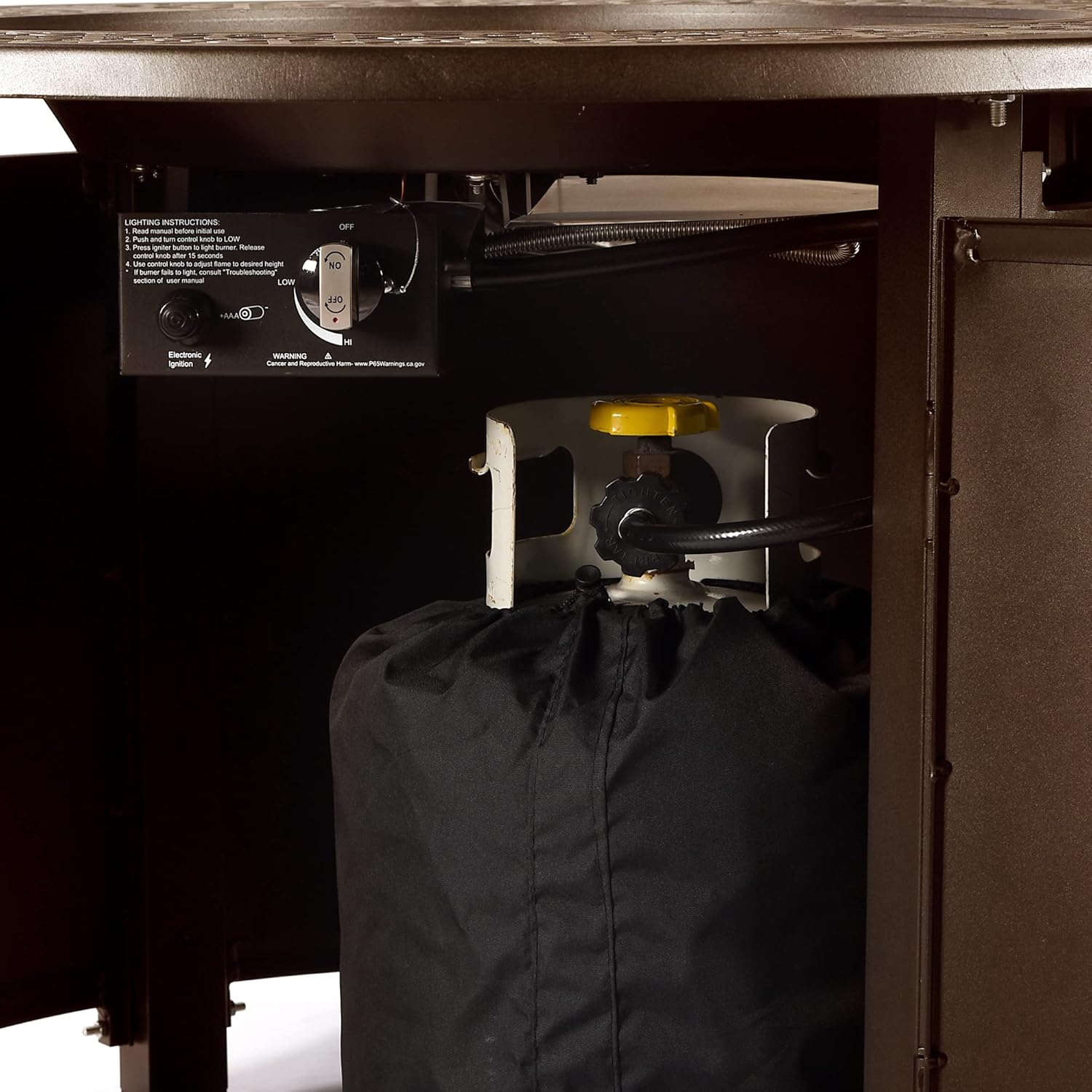 Bring the warmth and ambiance of this Round 44 in. x 44 in. Aluminum Propane Fire Pit Table with Glass Beads, Two Covers, Lid, 57,000 BTUs in Brown Finish to your patio, deck or backyard. Featuring a stylish clean durable powder coated finish, this fire pit is complete with a durable rust-free solid aluminum design base, making it an attractive centerpiece for your outdoor living space. Complete with a 57,000 BTU stainless steel burner and integrated ignition, you can enjoy all the ambiance of a classic fire without the mess or danger of tending ashes. All of the complicated electrical and gas control components are preassembled unlike other fire tables. This fire pit comes with clear fire glass, a table lid, propane tank cover and a protective table fabric cover. The dimensions for the propane fire pit table are: 44" L x 44" W x 24.5" H, 71.5 lbs.