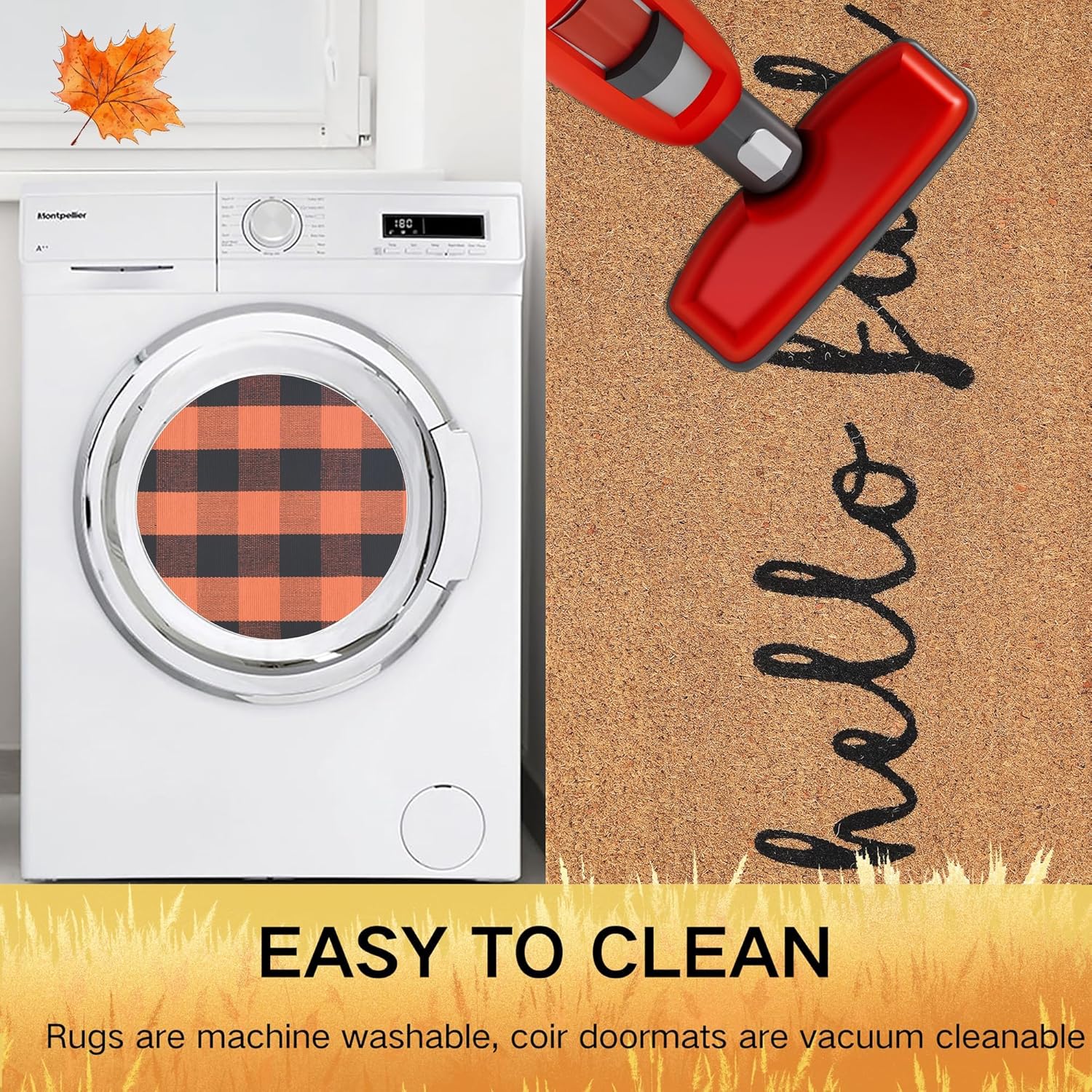 Welcome the cozy autumn season with this Fall Decor Doormat Combo Set. The Hello Fall Coco Coir Welcome Mat, measuring approximately 18 x 30 inches (45.7 x 76.2 cm), greets your guests with a charming message and natural coir material that effectively traps dirt and moisture. Complement it with the Plaid Rug, a stylish and durable accent piece that adds a touch of fall warmth to your entryway or porch. This combo set is perfect for creating a festive and inviting atmosphere, making it an ideal choice for Thanksgiving or any autumn celebration. Easily maintain the mats by shaking or vacuuming regularly, and enjoy the cozy ambiance they bring to your home during the fall season.