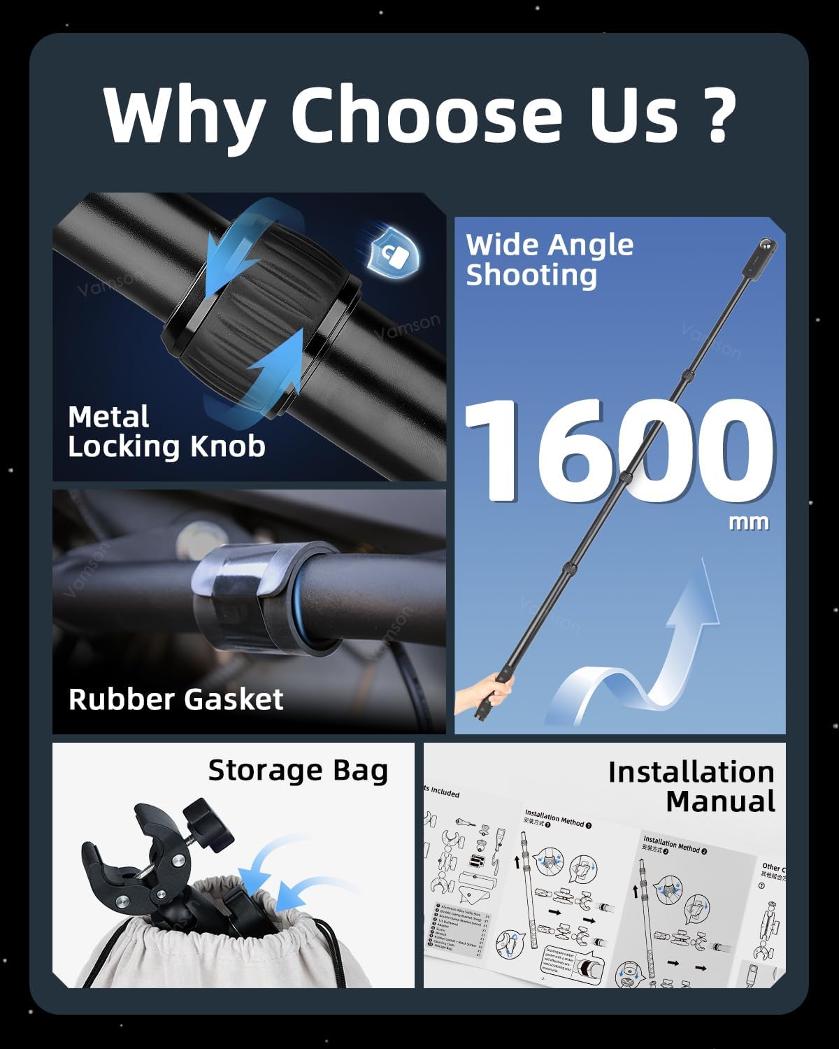 | BuiltIn Media | Aluminum Alloy Invisible Selfie Stick, Double Clamp Bracket |