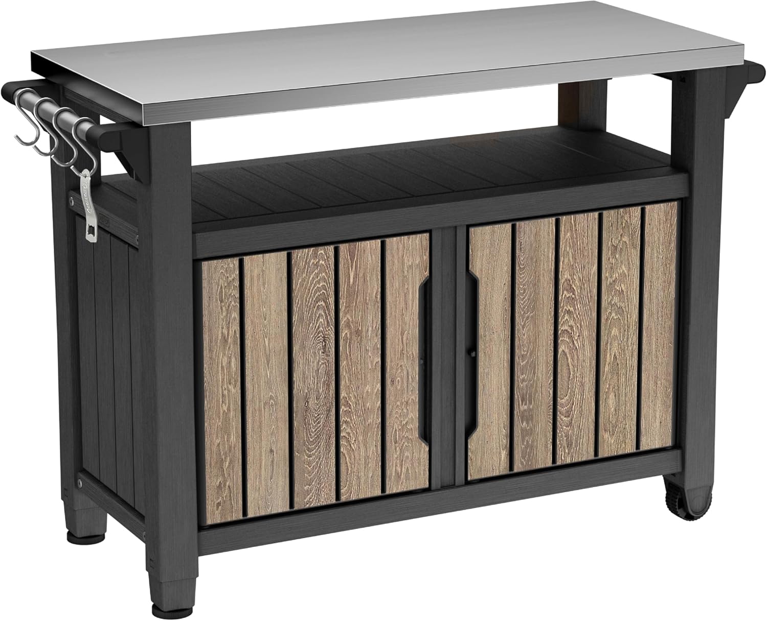 Transform your outdoor entertaining with the Keter XL Rolling Bar Cart in Dark Brown. Crafted from durable polypropylene (PP) and a stainless steel top, this bar cart combines elegant design with practical functionality, making it an essential addition to any patio, deck, or backyard space. Imagine effortless gatherings where drinks are served with style. The XL size provides ample space for holding beverages, snacks, and bar accessories, all conveniently accessible on its sturdy shelves. The cart's smooth-rolling wheels ensure easy mobility, allowing you to effortlessly transport it wherever the party goes. Built-in features like a handy bottle opener add convenience, while the dark brown finish complements any outdoor decor, creating a sophisticated ambiance. Whether hosting poolside parties, outdoor barbecues, or simply enjoying a sunny afternoon, the Keter XL Rolling Bar Cart enhances the experience with its blend of practicality and aesthetic appeal. Crafted to withstand the elements, this grilling cart is weather-resistant and easy to clean, ensuring long-lasting durability and minimal maintenance. Featuring a robust construction, this utility cart not only guarantees years of reliable use but also showcases Keter's commitment to quality craftsmanship. Ideal for both personal use and gifting, the Keter XL Rolling Bar Cart is a versatile solution for anyone looking to elevate their outdoor living space. Experience the joy of effortless entertaining and timeless elegance with this essential outdoor furniture piece.