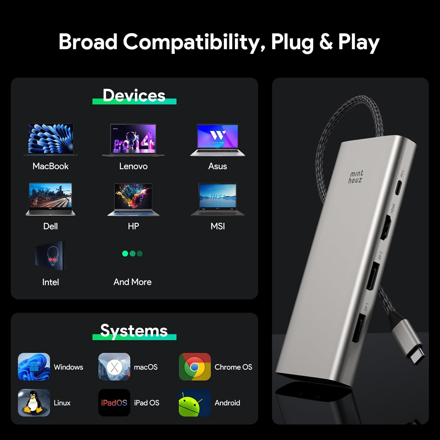 Minthouz Triple Display USB C Dock 12 In 1 with 85W Power Delivery This hub offers seamless plug-and-play functionality, effortlessly boosting your multitasking capabilities. With support for single 4K@144Hz display and triple 4K displays (under DP1.4 & DSC1.2), it's ideal for expanding displays for diverse tasks like meetings, gaming, presentations, stock chart analysis, programming, and design work. Equipped with an ample 85W power supply, this powered hub ensures your host device stays charged throughout the day. Its Gigabit RJ45, USB 3.0/2.0 ports, SD/TF card reader, and audio/mic port enhance efficiency and convenience. Seamless Expansion: Transfer files swiftly with 2 USB 3.0-A ports with up to 5Gbps speed for hard drives and U disks, while 2 USB 2.0-A ports simplify connections for keyboards, mice, or printers. Quick File Transfers: Easily transfer files with SD/Micro SD card slots, supporting various formats at speeds up to 104 MB/s. Perfect for storing and moving photos and videos from your camera during trips. Fast Networking: Benefit from the Gigabit Ethernet port for lightning-fast internet connections and data transfers at up to 1000 Mbps, ensuring reliable performance. Integrated Audio & Mic: Experience high-quality sound with the 2-in-1 audio/mic port, enabling clear communication through your headset without the need for separate ports. Stylish & Durable Design: The sleek aluminum housing and nylon cord design provide a stylish look while offering protection against daily wear and tear, making it both elegant and long-lasting. Systems/Devices Compatibility -Plug and play on Windows, Mac OS, Chrome OS, Linux, iPad OS, iOS, Harmony OS, Android. -Works with your USB-C Desktop PCs, Laptops, Tablets, Mobile Phones(OTG function required). Multiple Display Resolution (Max. Resolution) Notice: Please make sure the type-C port of your host supports video output. a. For Windows OS(*Some laptops only support 3 monitors due to their graphic card limit) 1)Single Display: HDMI 1/2: 4K@60Hz (DP1.4 & DSC1.2); 4K@60Hz (DP1.4); 4K@30Hz (DP1.2) DP: 4K@144Hz (DP1.4 & DSC1.2); 4K@60Hz (DP1.4); 4K@30Hz (DP1.2) 2)Dual Display: HDMI 1/2+DP: 2x 4K@60Hz (DP1.4 & DSC1.2); 4K@30Hz+1080P@60Hz (DP1.4); 2x 1080P@60Hz (DP1.2) HDMI 1+HDMI 2: 2x4K@60Hz (DP1.4 & DSC1.2); 4K@30Hz+1080P@60Hz (DP1.4); 2x 1080P@60Hz (DP1.2) 3)Triple Display: HDMI 1+HDMI 2+DP: 4K@60Hz+2x 4K@30Hz (DP1.4 & DSC1.2); 3x 1080P@60Hz (DP1.4); 2x 1080P@60Hz+lower than 1080P@60Hz (DP1.2) b. For Mac OS(*only supports extend 1 external monitor with different content) 1)Single Display HDMI 1/2: 4K@60Hz (DP1.4 & DSC1.2); 4K@60Hz (DP1.4); 4K@30Hz (DP1.2) DP: 4K@144Hz (DP1.4 & DSC1.2); 4K@60Hz (DP1.4); 4K@30Hz (DP1.2) 2)Dual Display: HDMI 1/2+DP: 2x 4K@60Hz (DP1.4 & DSC1.2); 2x 4K@60Hz (DP1.4); 2x 4K@30Hz (DP1.2) HDMI 1+HDMI 2: 2x 4K@60Hz (DP1.4 & DSC1.2); 2x 4K@60Hz (DP1.4); 2x 4K@30Hz (DP1.2) 3)Triple Display: HDMI 1+HDMI 2+DP: 3x 4K@60Hz (DP1.4 & DSC1.2); 3x 4K@60Hz (DP1.4); 3x 4K@30Hz (DP1.2) Specification 1.Model: MT-UMD312 2.Ports: Side 1: HDMI 1(4K@60Hz), HDMI 2(4K@60Hz), USB-C(PD IN,100W); Side 2: 2x USB2.0-A(480Mbps), 2x USB3.0-A(5Gbps), SD Card Slot, TF Card Slot; Side 3: DisplayPort(4K@144Hz), Gigabit RJ45; Side 4: Audio/Mic Port 3.Unit Size: 14.2 x 5.6 x 1.8cm/ 5.6 x 2.2 x 0.7in (L x W x H) 4.Cable Length: 25cm/9.8in 5.Unit Weight: 126g/4.4oz 6.Housing Material: Aluminum Features - Triple display with 2x HDMI + DP: DP supports up to 4K@144Hz (DP 1.4 & DSC1.2 source). - Two USB 3.0 ports with transfer speeds up to 5Gbps, backward compatible with USB 2.0/1.1 devices. - Two USB 2.0 ports with a transmission speed of up to 480Mbps. - Supports SST/MST. - The USB-C port with 100W PD IN provides 85W PD to the laptop. - Maximum Ethernet speed: 1000Mbps. - SD/Micro SD card reader slots. - Audio out & Mic in 3.5mm jack. Warm Tips 1.The type-C port of your host should support video output and charging to enjoy the full function of this hub. 2.For Windows-based computers, please ensure that your computer graphics card supports four monitors, or you may need to disable the built-in monitor. 3.Your USB-C phones/tablets should support the OTG function. 4.The charger and charging cable are not included. USB-C Devices Compatibility List (Partial): Note: Please check the compatibility list below before purchasing. If your device is not on the list, please let us know and we will be glad to help you check with it. Apple: Mac Studio 2022, iMac(2017, 2019, 2020), MacBook Pro 16-inch (2019, 2021),MacBook Air 13-inch (2018, 2019, 2020), MacBook Pro 13-inch (2016, 2017, 2018, 2019, 2020),MacBook Pro 14-inch 2021, MacBook Pro 15-inch (2016, 2017, 2018, 2019); Dell: XPS 13 7390 2-in-1 (Ice Lake), XPS 12 9250, XPS 13 9350, XPS 13 9360, XPS 13 9370, XPS 13 9380,XPS 15 9550 (Intel + Nvidia GPU), XPS 15 9550 (Intel GPU), XPS 15 9560 (Intel + Nvidia GPU), XPS 15 9570, XPS 17 9700,XPS 12 XPS9250,Dell LATITUDE 7480, Alienware 13 R3, Alienware 15 R3, Alienware 17 R4, Dell Precision 15 M7510, Dell Precision 17 M7710, Dell XPS 13 9365, Dell Precision 15 5000 Series (5510), Dell Precision 15 3000 Series (3510), Dell Latitude 7370 (3C7XP), Dell Latitude 12 7275, Alienware 17 R3, Dell Precision M5510 15.6"; HP: EliteBook Folio G1 (Model V1C43EA), Spectre x360 Convertible 13-w000 (SKU W9A95AV), Spectre x360 - 13-ac003la, Spectre x360 - 15-ch000, Elite X2 1012 G1, HP Spectre x360 - 13-ae011dx (Late 2017),Elite x2 1012 G2,HP Spectre x360 (2017),HP EliteBook Folio G1 12.5", HP ZBook 15 G3, HP Zbook 17 G3 Workstation, HP ZBook Studio Series, HP Elite X2 1012 G1, HP Spectre x360 2-in-1 13-W023DX 13.3"; Intel: NUC8i7HVK (Hades Canyon), NUC8i7HNK (Hades Canyon), NUC9VXQNX (Ghost Canyon), Intel NUC9V7QNX (Ghost Canyon), Intel NUC9i9QNX (Ghost Canyon), Intel NUC9i7QNX (Ghost Canyon), Intel NUC9i5QNX (Ghost Canyon); Lenovo: Thinkpad P50, Thinkpad P51, Thinkpad P70, Lenovo Yoga C930, Lenovo X1 Carbon 7th Gen, ThinkPad P70 Series Mobile Workstation, Lenovo Legion Y720, Lenovo Think