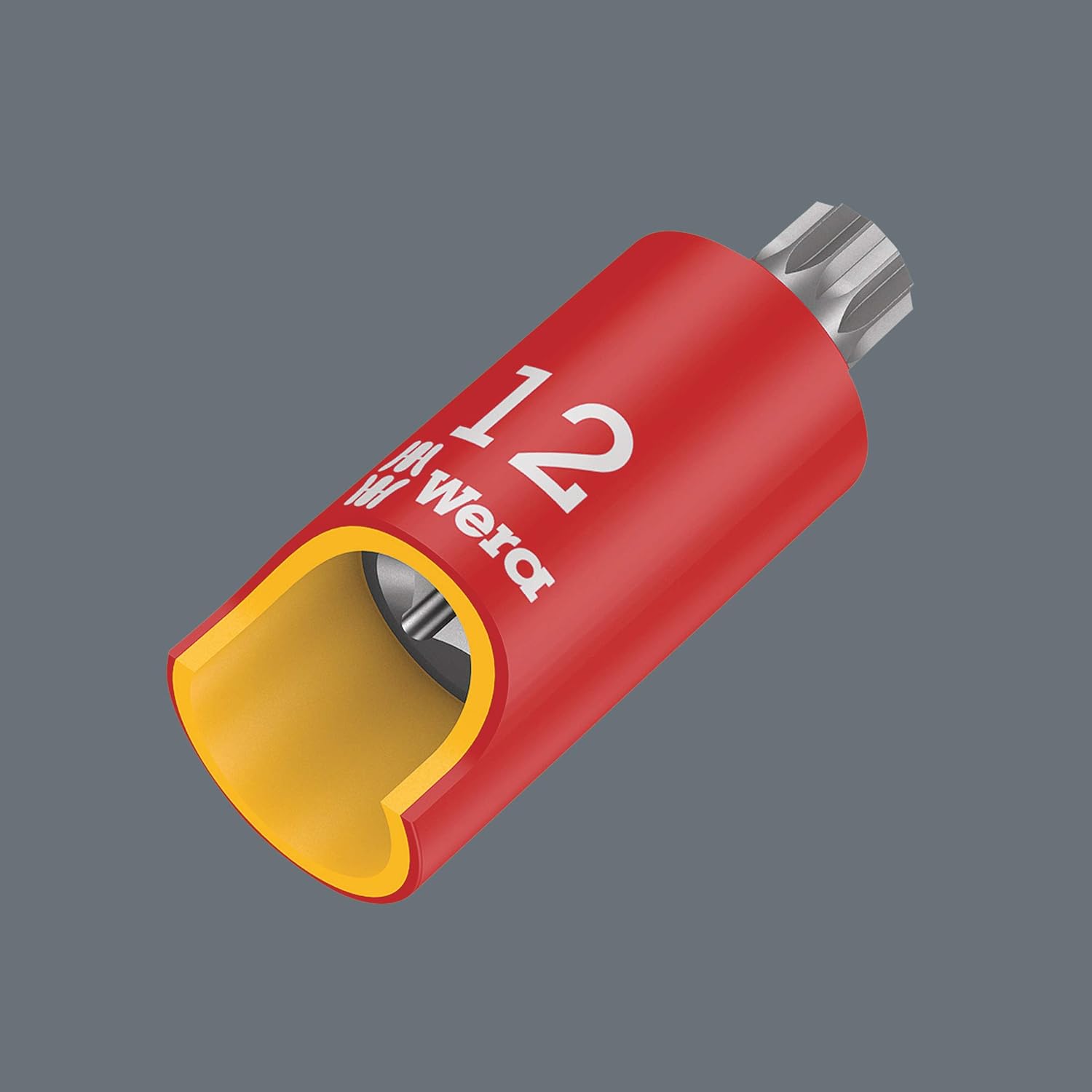 VDE ⅜“ bit socket with increased safety due to yellow insulation core, which becomes visible in case of damage to the outer red VDE insulation layer. Individually tested tool as per IEC 60900 at 10, 000 V for safe working at the approved voltage of 1, 000 V. With Take it easy tool finder with colour coding by size - for easy and quick location of the required tool. Included components: 8760 B VDE XZN Zyklop bit socket, insulated, 3/8" drive, for multi-point socket screws, M 12 x 59 mm.