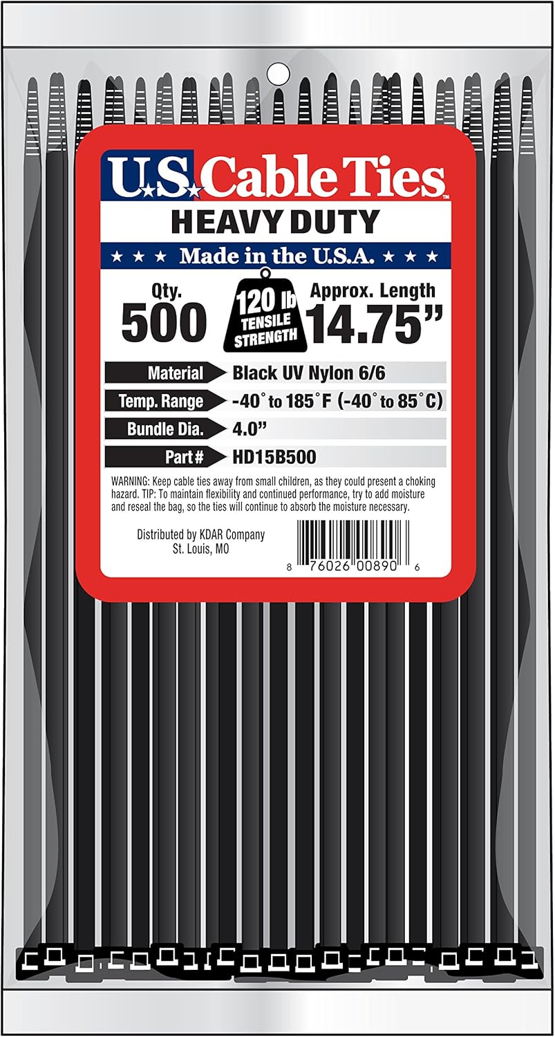 US Cable Ties Heavy Duty cable ties are made from high strength and lightweight 6/6 nylon. Nylon 6/6 is a hygroscopic material, which absorbs and releases moisture, is non-toxic, and has a working temperature range of-40 to 185-Degree F (-40 to 85-Degree C). Heavy Duty cable ties are approximately.08-Inch thick and.30-Inch wide. Our UV Black cable ties are UV stabilized for outdoor use. Tensile Strength of 120-Pound.