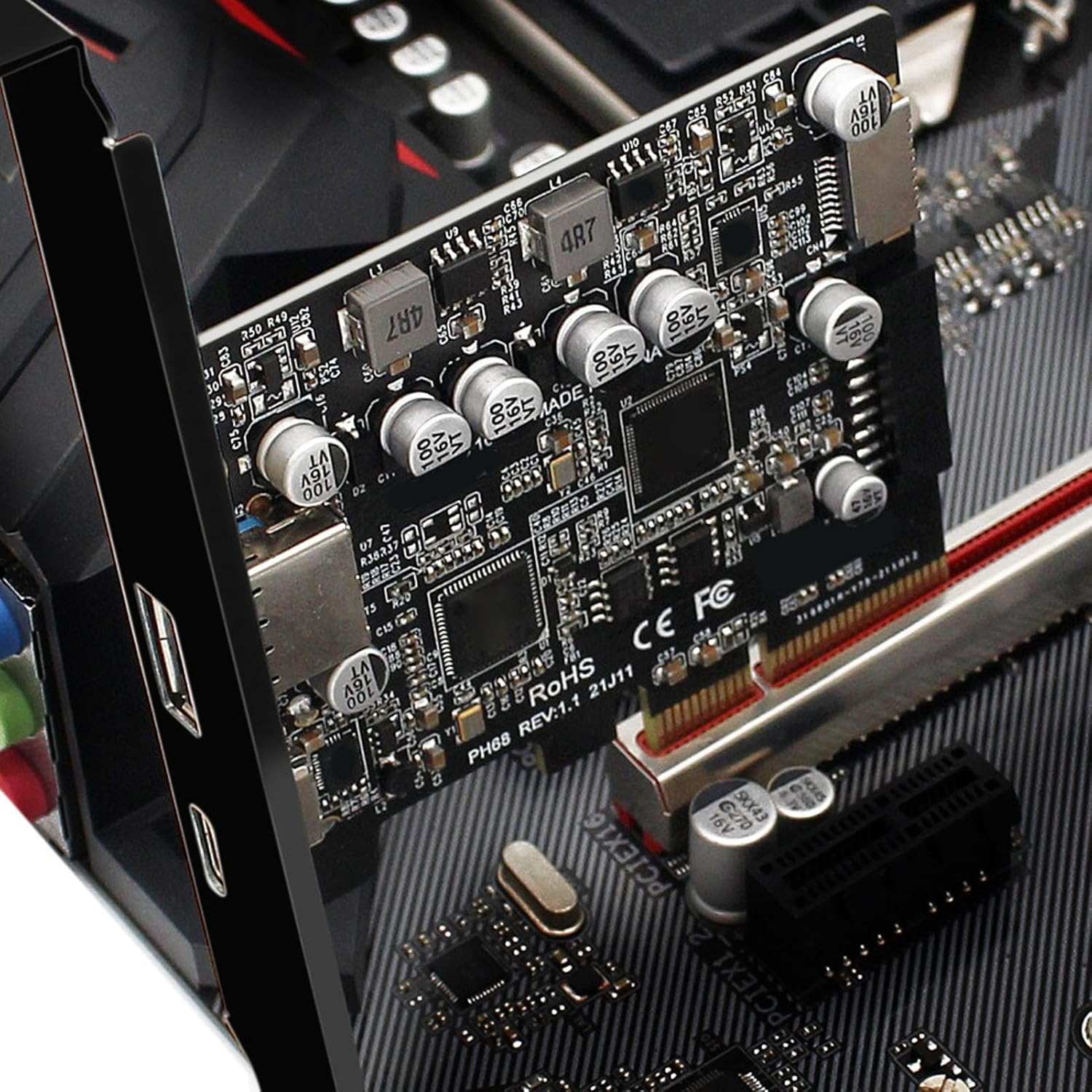 1. Enhanced Safety: Efficient and stable PWM synchronous chip, protected by port guard chip. Each port equipped with 2.2A guard chip to prevent damage from external device malfunction or short circuit, ensuring user safety and peace of mind. 2. High Speed: Main control power chip determines stability, using ASM3142 and VL822 main control chip for USB3.2 GEN2 10Gbps, with PCIE bandwidth up to 16Gts, providing 10Gbps speed for each port. 3. Multiple Interface: 10Gbps high speed, PCIEX4 expansion card with full interface USB3.2 expansion, featuring USB3A port, Type C, front Type E, 19 20PIN, the expansion card is ideal for desktop computer expansion to meet all your needs. 4. High Performance: The PCIE USB hub adapter is to oxidation, excellent conductivity, and wear . Compatible with USB3.2 Gen2 10Gbps, down compatible with USB1.1, USB2.0, USB3.0, and USB3.1 6Gbps. 5. Wide Compatibility: Compatible with X8 X16, meeting PCI Express3.0 specifications and XHC1 protocol, for Wins Vista 7 (driver required), for Wins 8 10 systems have builtin drivers, providing 10Gbps speed. Specification: Item Type: PCIe3.0 to USB3.2 Expansion Card Material: PCB Input Interface: PCI-EX4 (x 2) compatible with X8/X16 Compatible: USB3.2 Gen2 10Gbps, downwards compatible with USB1.1, USB2.0, USB3.0, USB3.1 6Gbps Conforms to: PCI Express 3.0 basic specification Conforms to: Extended Host Controller Interface (XHC1) Specification Revision 1.0 Compatible System: For Wins /Vista/7 (driver installation required), For Wins 8/10 plug and play Speed: 10Gbps How to Use: Installation is completed and ready to use. Package List: 1 x PCIe3.0 to USB3.2 Adapter 1 x Bracket 1 x Screw
