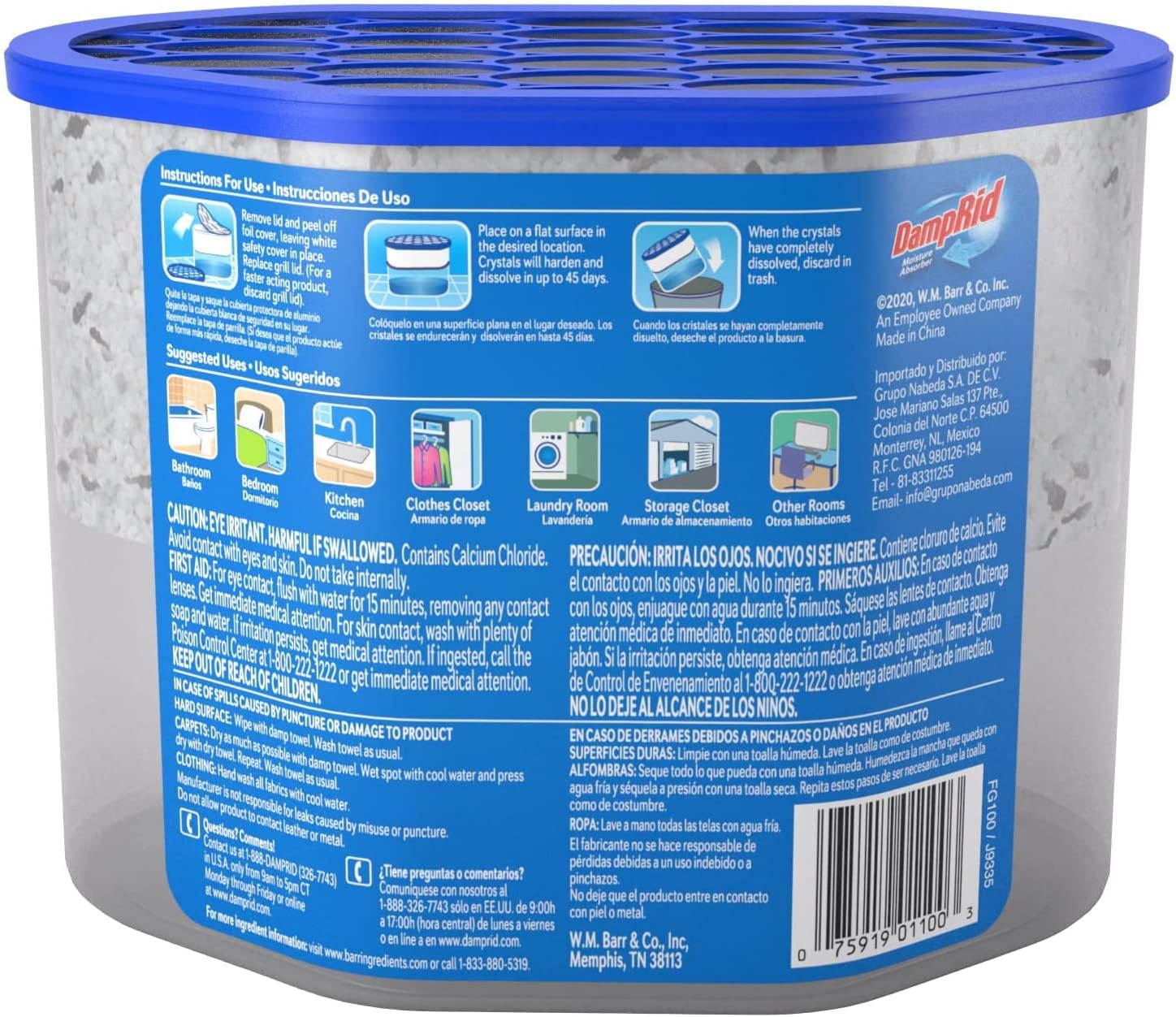 Don't just cover up odors, eliminate them with the DampRid Fragrance Free Disposable Moisture Absorber. These convenient, 10.5-ounce disposable cups effectively absorb excess moisture out of the air to create and maintain the optimal humidity level – eliminating stale, musty odors. Once the container is full of liquid and all the white crystals have completely dissolved, discard the container in the trash. It's perfect for continuous moisture control in bathrooms, laundry rooms, kitchens, closets, pantries or any room where excess moisture and stagnant air are an issue. Lasts up to 45 days, depending on temperature and humidity. Keep out of reach of children. Do not use in moving vehicles or allow product to contact leather or metal.