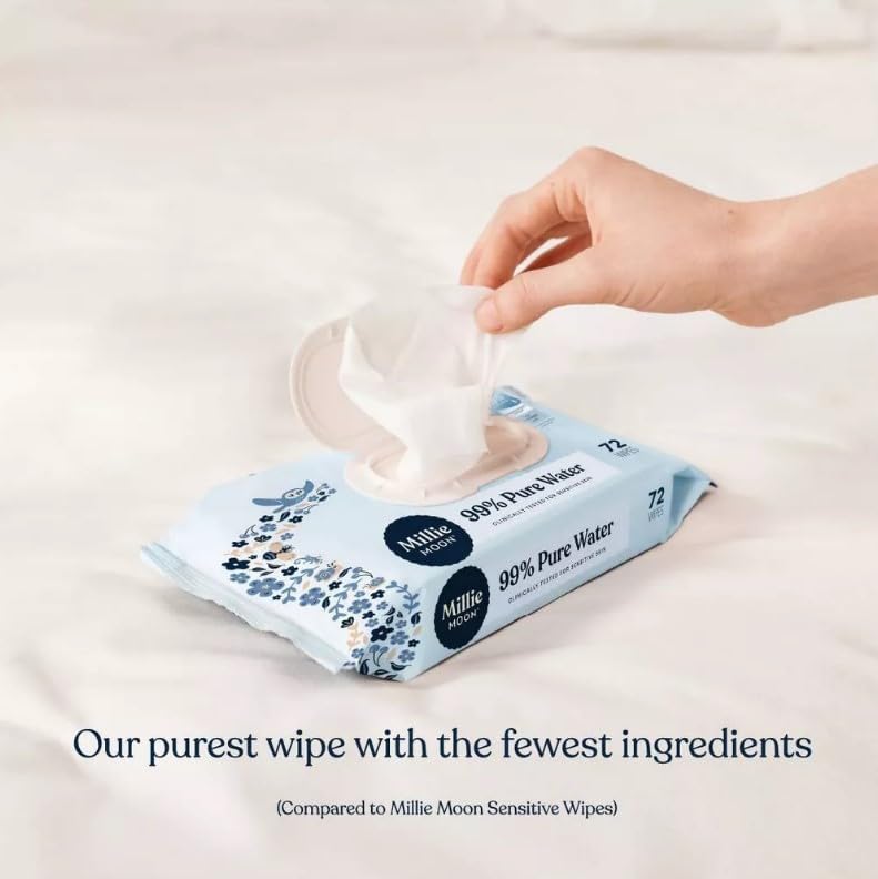 Keep your baby's delicate skin clean and fresh with Millie Moon 99% Pure Water Baby Wipes. These gentle wipes are formulated with 99% pure water, making them perfect for sensitive skin during diaper changes and everyday cleanups. The pack includes 576 wipes, ensuring you'll have plenty on hand for all your baby care needs. Each wipe provides effective yet gentle cleansing for your little one's face, hands, and diaper area. The wipes maintain the right amount of moisture to clean effectively while being soft and comfortable on your baby's skin. These versatile wipes are convenient for both at-home use and on-the-go situations. The practical pack size means you won't run out quickly, saving you time and providing peace of mind. Suitable for use from day one, these wipes help maintain your baby's skin health with every gentle wipe.