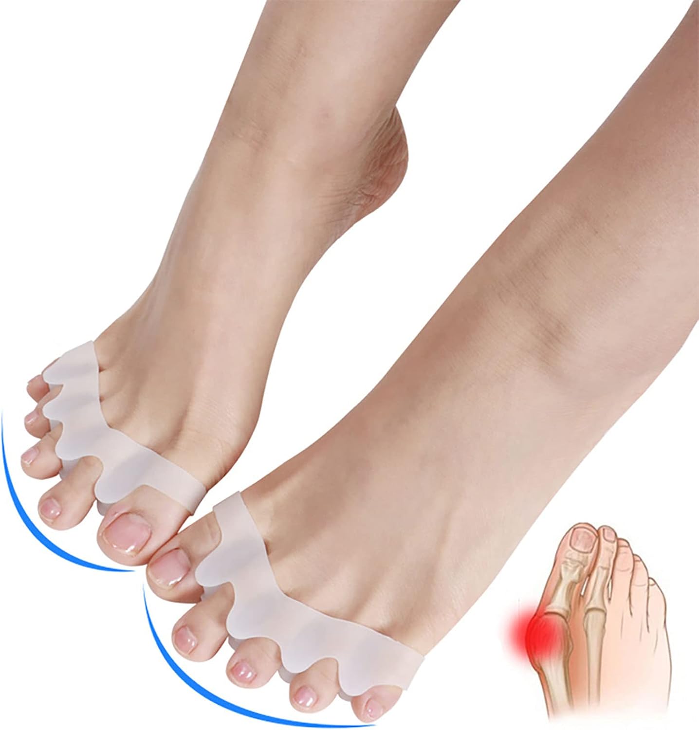 Bunions. Hallux Valgus, Corns, Calluses and Blisters. These may form from wearing narrow uncomfortable shoes or from your walking manner. The big toe's joint carries much of the weight and any deformations may cause constant and unbearable pain.Features:1.Special design toe separators for relieving foot pain and correcting hallux valgus.2.Adopts gel material, non-toxic, with good stability, aging resistance, heat resistance, high elasticity and compression without deformation.3.Can be used at night, while watching TV, dancing, practicing yoga or workout.4. Suitable for hammer toes, claw toes and other unsightly foot problems.Specification:Item Type: Hallux Valgus CorrectorMaterial: gelQuantity: 2 pairColor: whiteOptional Size: one sizePackaged List:2 x Hallux Valgus CorrectorNotice:1. All dimensions are measured manually, please allow us to have an error of 1-2 mm.2.For the first time, please wear 10-20 minutes, and then gradually increase the usage time.3.Not recommended for people with poor circulation.4.It is recommended for hand washing, not for sun exposure.5.Please wear larger shoes if necessary.We attach great importance to our service, if there is any problem with the product, please contact us and we will handle it properly.