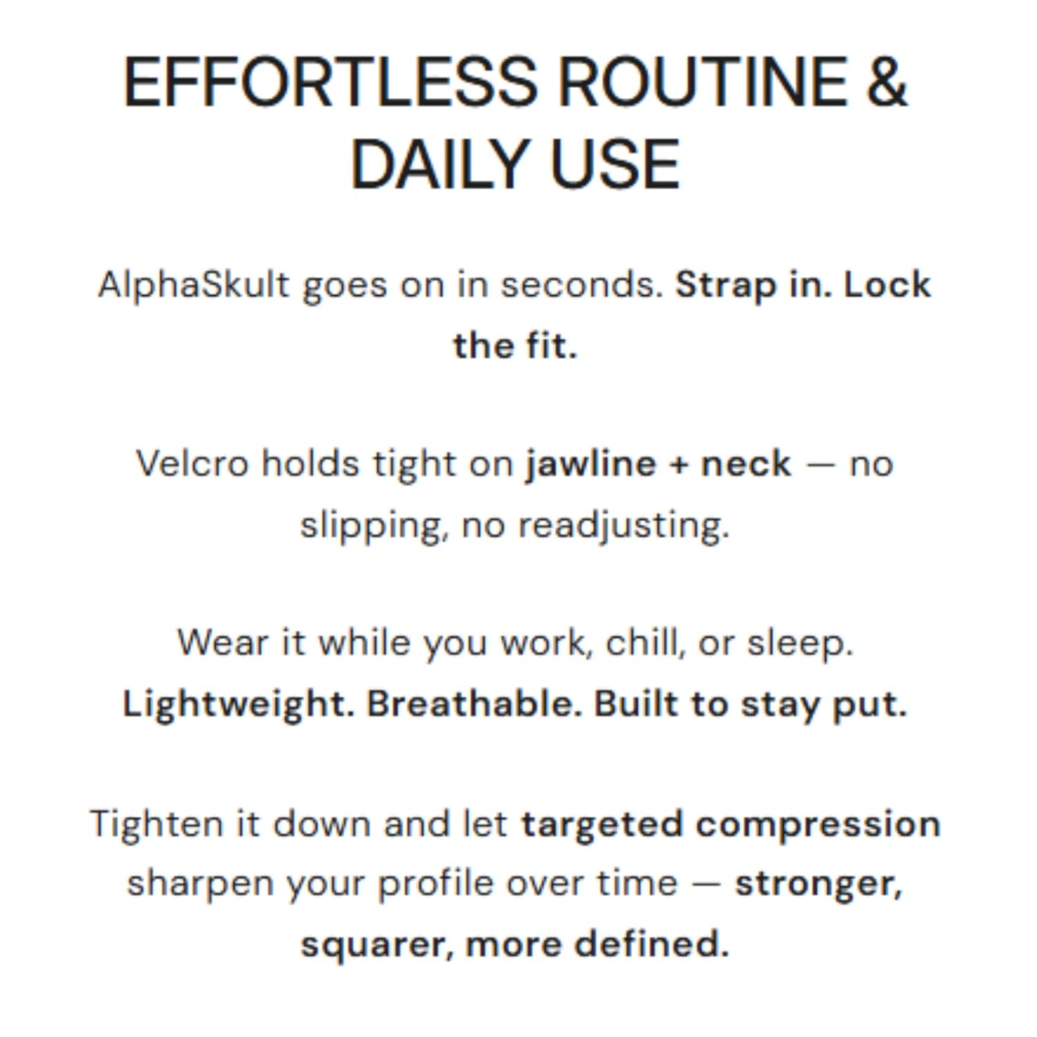 Gentle & Effective Jawline Support:Our Alphaskult jawline sculpt wrap is engineered to provide subtle, consistent support to the chin and jawline, helping men refine their facial contour effortlessly. The soft, elastic fabric exerts gentle pressure to enhance the definition of the jawline, supporting a more sculpted appearance without any harsh or uncomfortable force—perfect for daily grooming routines focused on facial refinement.Ultimate Comfort for All-Day Wear:Designed with men’s daily needs in mind, this collagen face sculpt wrap offers exceptional comfort whether worn for short periods or extended hours. The lightweight, breathable fabric prevents stuffiness and skin irritation, while its flexible structure moves with your facial expressions, ensuring you barely notice it during daily activities or nighttime use. Say goodbye to uncomfortable, bulky facial shaping tools—this wrap prioritizes comfort without sacrificing effectiveness.Overnight Care, Continuous Shaping: Wear the Alphaskult Jaw Shaping Band while you sleep to provide continuous support for your jawline throughout the night.Everyday Wear: Whether you’re relaxing at home, working at your desk, or running errands, this shaping band is your perfect everyday companion. Made from lightweight material, it remains discreet under shirts and hoodies, allowing you to go about your daily activities without drawing attention.Travel and On-the-Go Care: Pack this portable jawline shaper in your travel bag—it’s an essential for both vacations and business trips. Its compact size takes up almost no space, and the washable design makes it easy to clean while on the go.