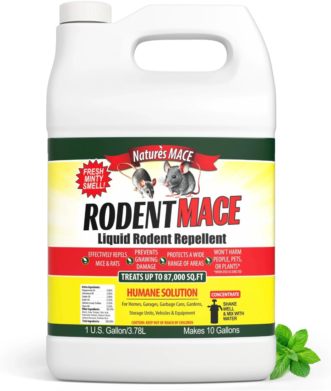 Shake well before every use. Apply daily for the first 7 days. Spray liberally around areas rodents may enter, feed, or hide. Seek out entry points, runways, and nests. Repeat spraying in 7 days, spray once per week thereafter for maintenance. Apply alongside your home’s foundation and work outwards to keep rodents out. Apply heavily around suspected entry points and problem areas. For the concentrates, this product requires mixing with water in a lawn or garden application sprayer. See the back label for mixing ratios. For vehicle protection, including but not limited to, cars, trucks, tractors, boats, motor homes, etc. spray onto engine compartments, wheel wells, wirings, and anywhere else you can reach. Spray around the outside of the vehicle to establish a perimeter. When used for automotive use, check the engine compartments and remove any nestings before applying. Use an air compressor to remove any food or clutter. If there are signs of rodents, thoroughly wash the area with soap and water to prevent them from returning. You can also apply this to a piece of cloth or towel and place it in the problem area. Rodent MACE incorporates a proprietary sticking agent proven to increase product duration and effectiveness. Our technology ensures adhesion to treated areas, protecting longer.