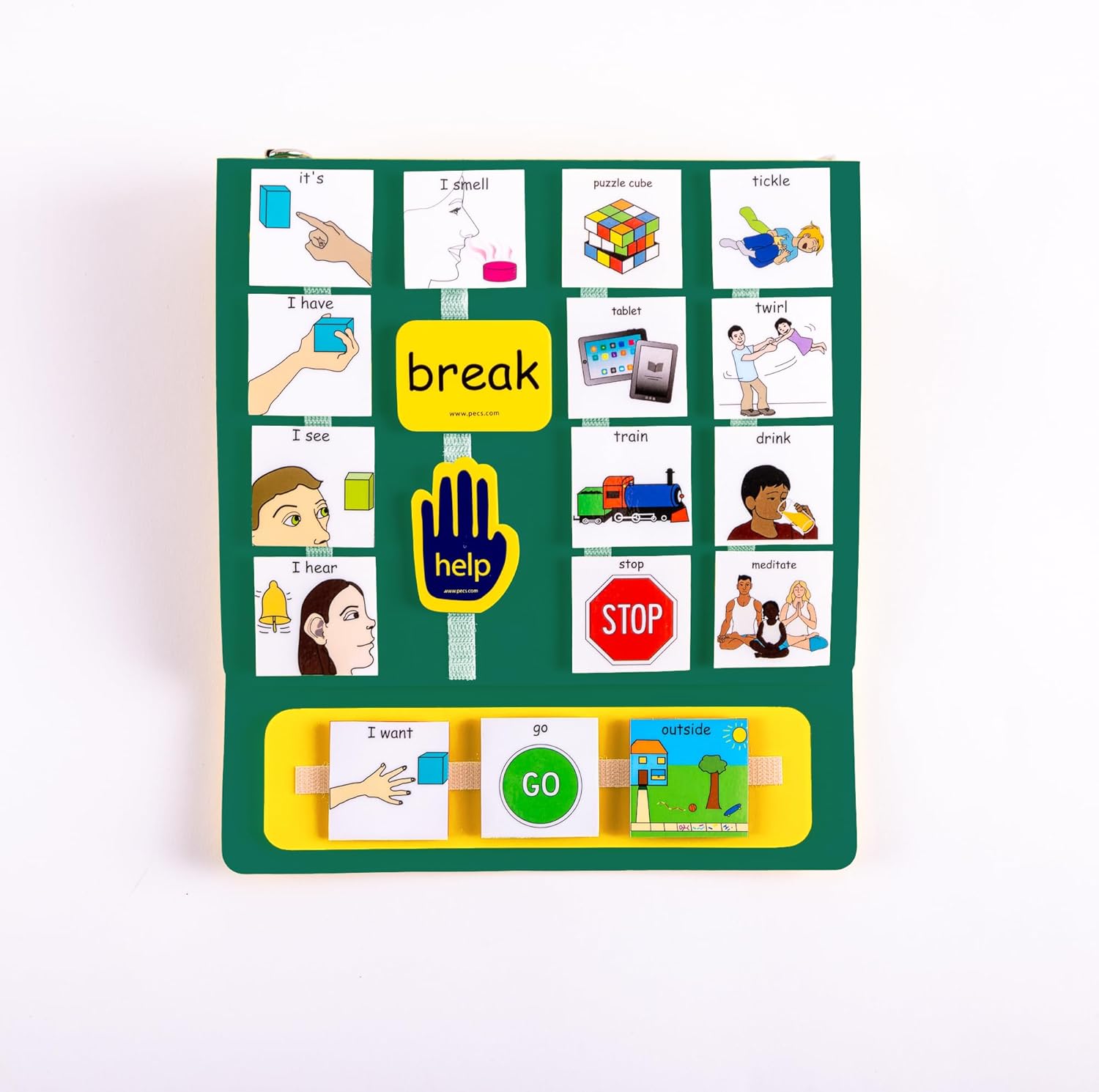 The Large PECS Communication Book is an invaluable tool for individuals who rely on picture-based augmentative and alternative communication systems. Constructed from a safe, poly-plastic material to withstand daily use, ensuring reliable communication, this durable 3-ring binder measures 10 ¼” x 9 ¼” and is perfect as a first book for new PECS users! With its unique design, the back of the book is longer than the front to accommodate the Sentence Strip. This allows access to the Sentence Strip no matter which page in the book is in use. Book includes two 8 ½” X 6 ½” non-tabbed Insert Pages, one 8″ x 2″ Sentence Strip and strips of VELCRO Brand hook fasteners for self-assembly. Sentence Strip varies in color from those pictured. Exact color shades of the products may differ from those pictured. Pictures sold separately.