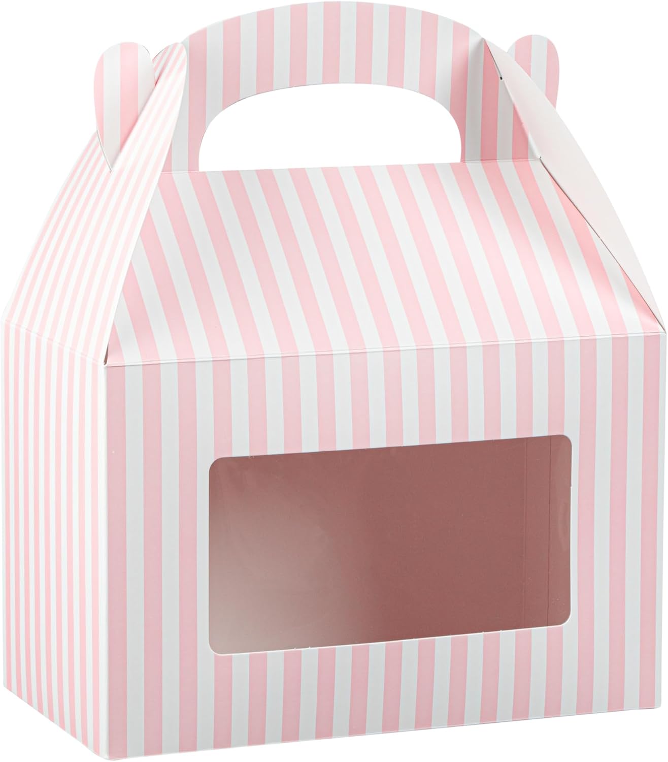 Entice customers and boost bakery sales with eye-catching packaging. Bio Tek Pink and White Stripe Paper Gable Boxes / Take Out Containers feature an integrated plastic window that provides an enticing sneak peek of your delicious treats, enhancing impulse snack purchases. These window display boxes include a built-in handle, making it easy to carry bulk orders comfortably and efficiently. With a freezer-safe design, these wedding favor boxes preserve baked goods longer, ensuring your pastries remain fresh and ready for any event. Crafted from sturdy paper, these versatile boxes are 8.5 inches in length, 4.75 inches in width, and 5.5 inches in height, providing ample space for showcasing your creations while offering recyclability for eco-conscious businesses. Elevate your presentation and streamline your operations with these innovative packaging solutions. Sold in a 25 count box.