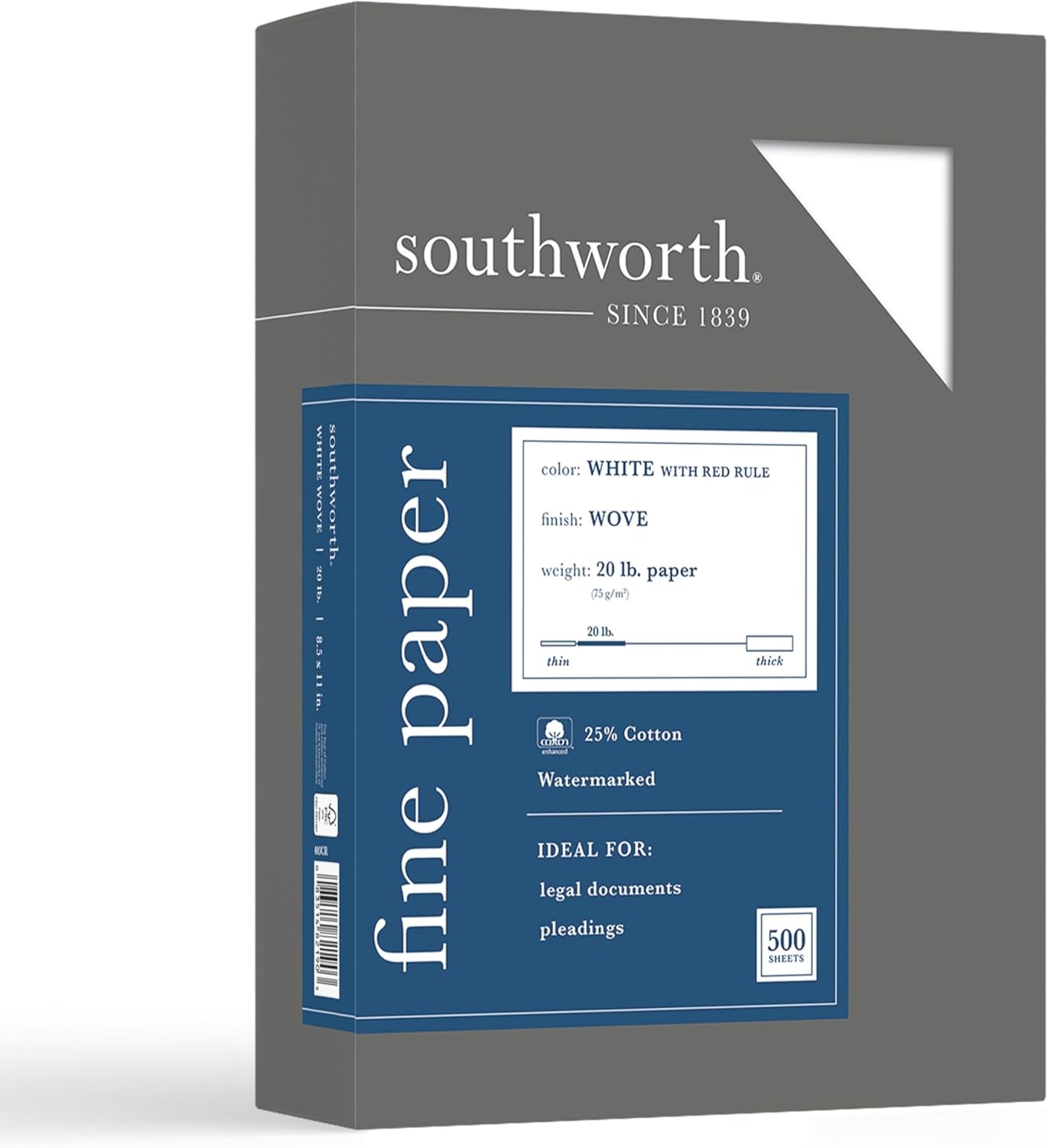Life Is Noteworthy. Create official letterheads, forms, and other documents with this Southworth 25% Cotton Fine Business Paper. The smooth finish bring out the best in graphics and rich text, while the 20-pound stock is ideal for quick print jobs and everyday use. This Southworth business paper comes watermarked and date-coded to put an official stamp on company documents.