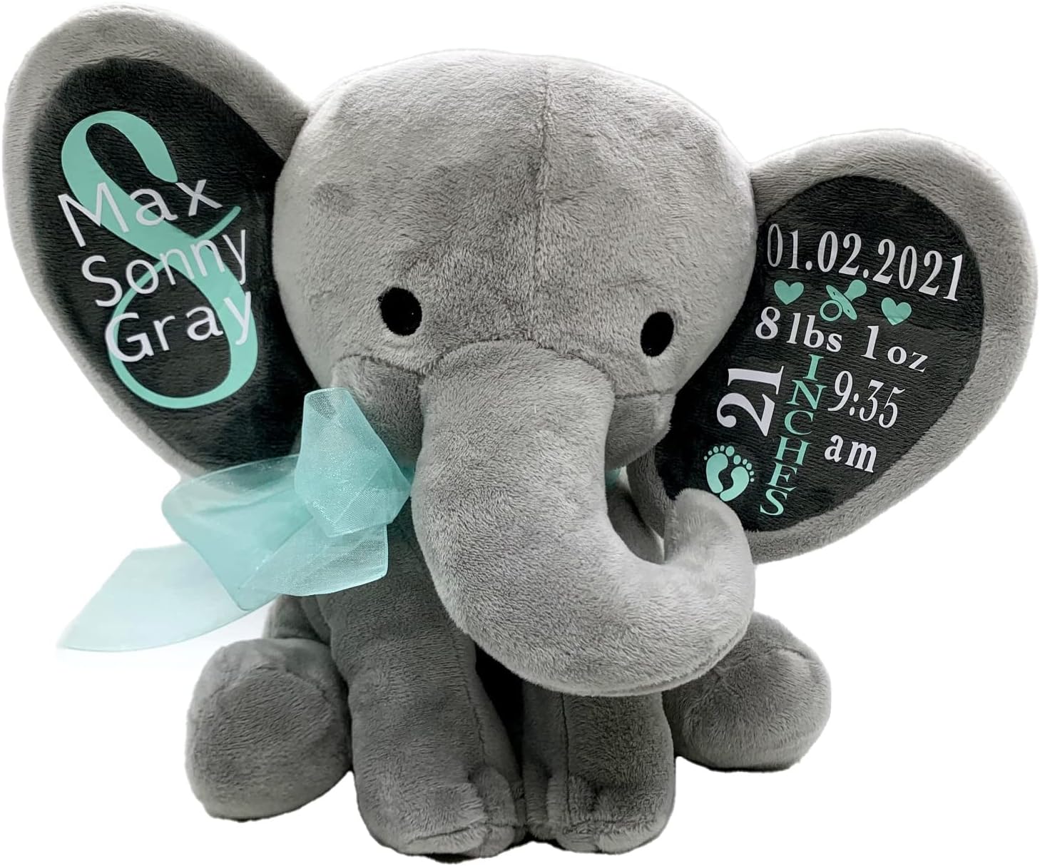 This soft plush grey elephant is the perfect keepsake gift for any baby boy or baby girl! Birth statistics are personalized with high quality heat transfer vinyl in White and your choice of color. Each elephant comes with a matching color decorative ribbon. PRODUCT INFORMATION Elephant measurements: approx. 9" (H) x 8.5’’ (W)High quality heat transfer vinyl in White and your choice of: BLUE, PINK, PURPLE or GREENComes with matching color decorative ribbonCare Instructions: Spot Clean and Air DryThis keepsake is not intended for play and meets CPSC safety requirementsPlease Note: It is normal to have a bit of wrinkling of the vinyl on the elephant's ear as the ear is floppy and does not lay perfectly flatAs this is a custom personalized item, returns are not accepted.