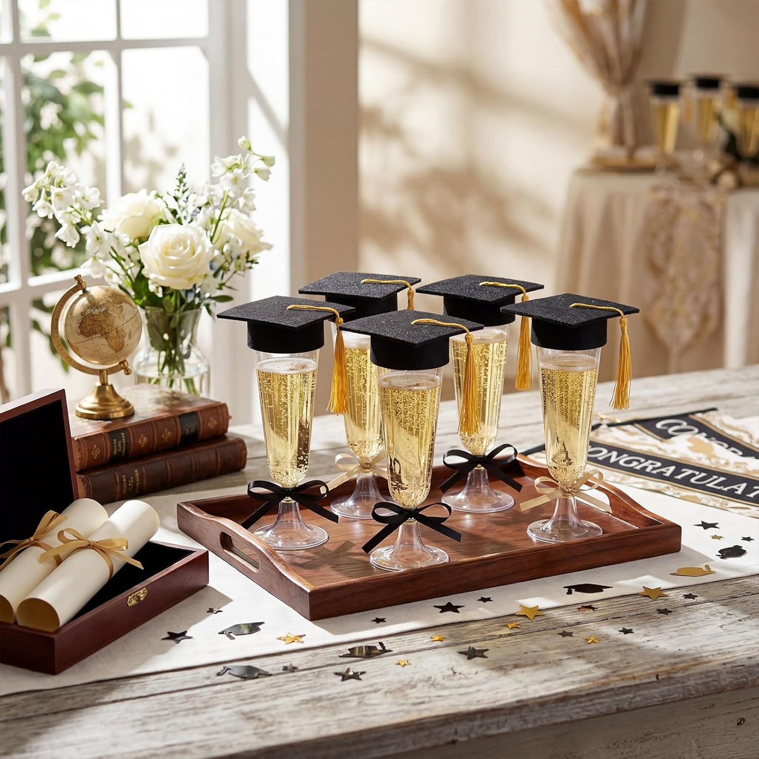 | Included Components | 50 x Champagne glasses ,50 x Graduation mini caps,8 x Ribbon |