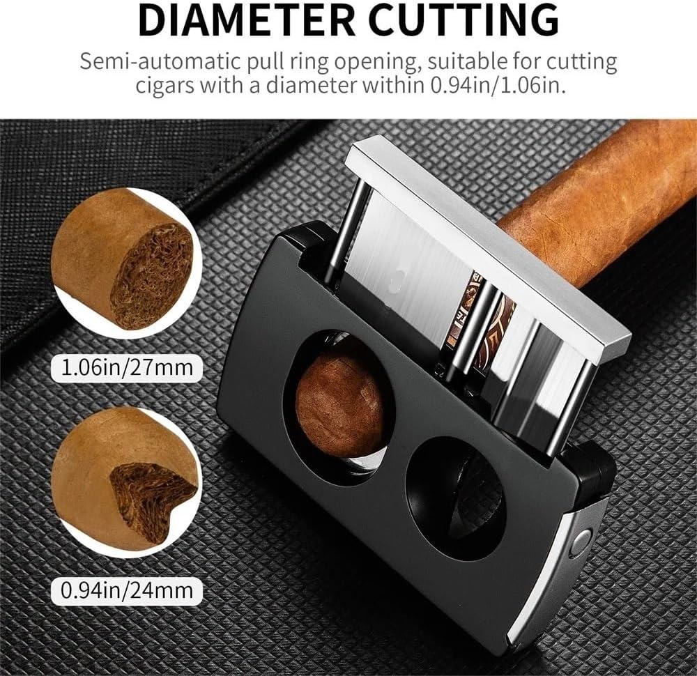 This premium cigar cutter features a hardened stainless steel blade that remains sharp even after repeated use. It can be operated with one hand with a simple press. Compact and lightweight, it easily fits into a cigar box or pocket for convenient carrying.