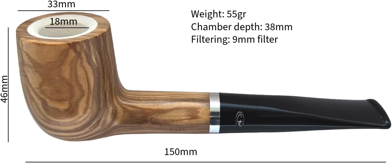 The M. Gasparini Ulivo is a beautifully handcrafted smoking pipe made from genuine olive wood, showcasing a rustic brushed finish that highlights the wood's unique natural grain patterns. Each pipe is one of a kind, making it a truly individual piece for the discerning pipe enthusiast. The bowl features a white meerschaum insert, which helps deliver a cool, clean, and flavorful smoke. The classic billiard shape is complemented by a sleek black acrylic stem with a polished silver band accent, blending traditional craftsmanship with refined style. Measuring approximately 5.9 inches (150mm) in total length and weighing around 1.97 oz (56g), this pipe is comfortable to hold and easy to carry. The chamber depth is approximately 1.38 inches (35mm) with an 18mm bore, and it accommodates a standard 9mm filter. Whether you are a seasoned collector or a newcomer to pipe smoking, this M. Gasparini olive wood pipe makes an exceptional addition to any collection or a distinguished gift for any occasion.
