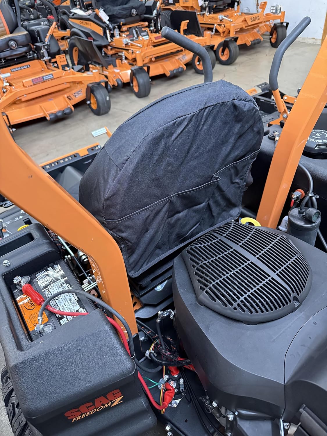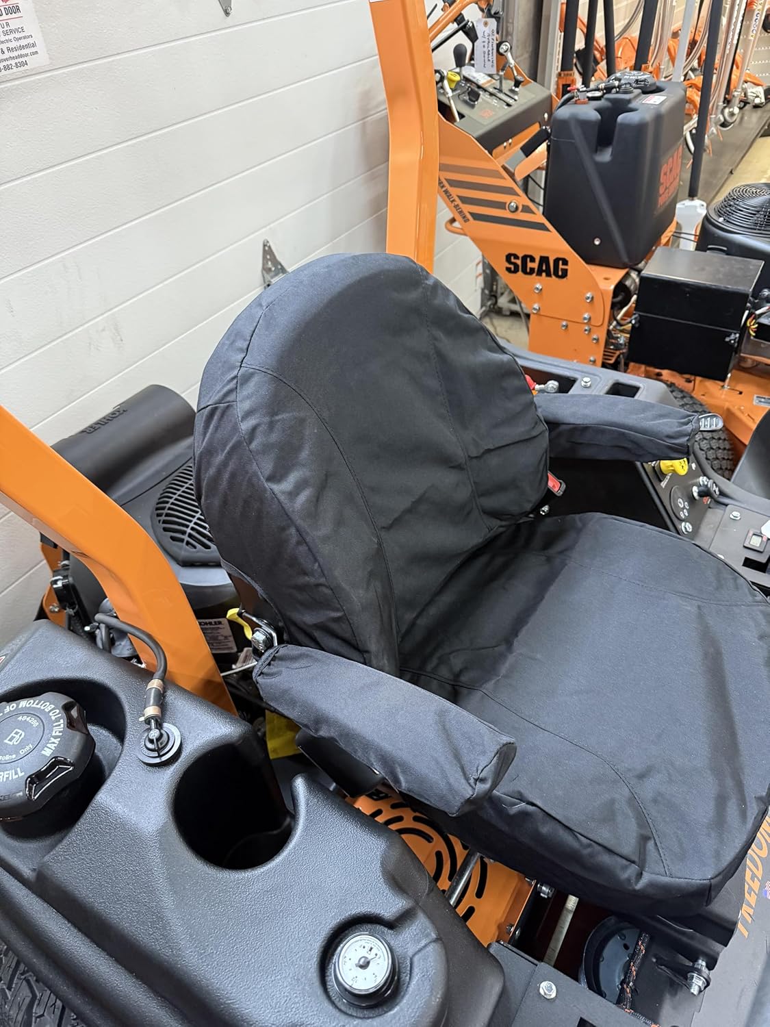 Exact Fit Seat Covers compatible with Ferris 500/700 series and SCAG Patriot and Freedom Z Zero Turn mowers. 2 piece seat with armrests. Good insulation for comfort on those hot days of summer. Instructions. 4 parts. 1) Slide the cover over the back section and join the Velcro at the bottom of the seat. 2) Seat base, position on seat And push flap through to the back of seat. Take straps from front under seat in seat cavity to buckles at rear and connect and tighten. 3) Slide armrest covers on. Enjoys years of comfort and Protection. Machine washable, hang dry. Check your seat against picture to make sure you have the correct configuration