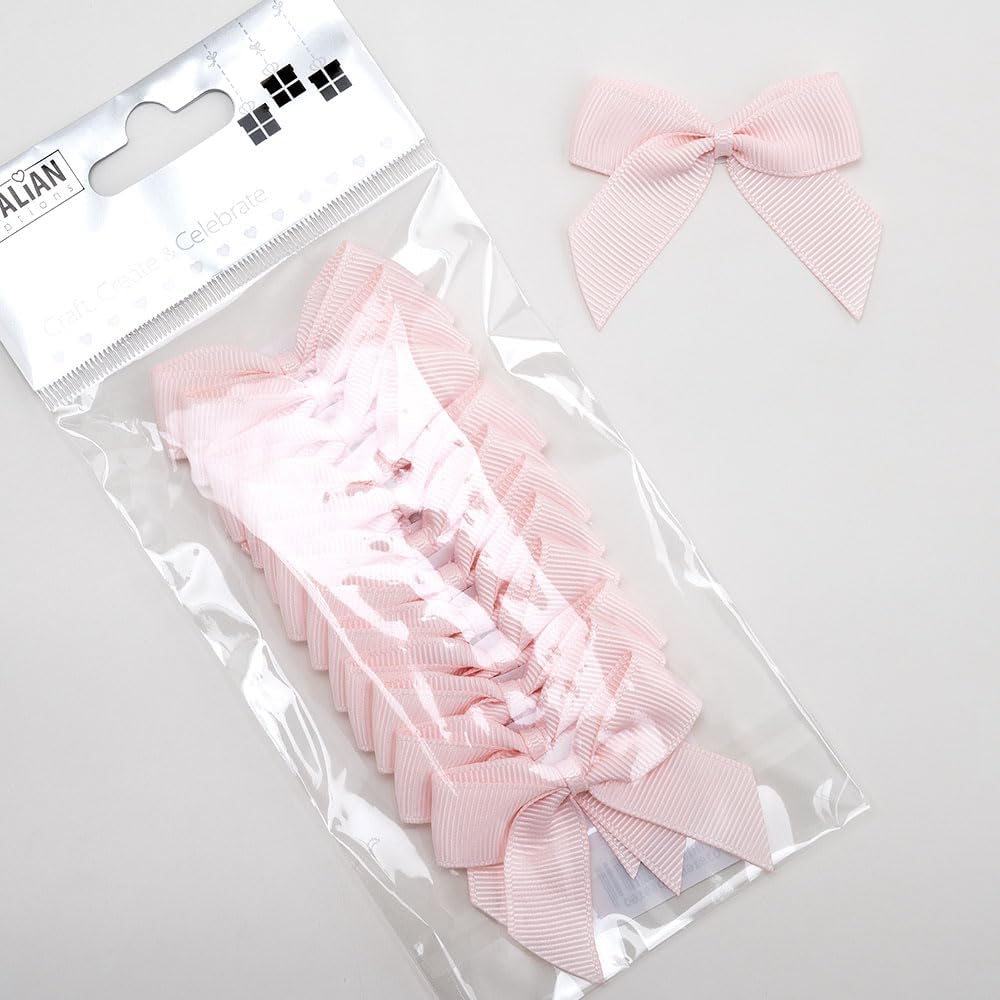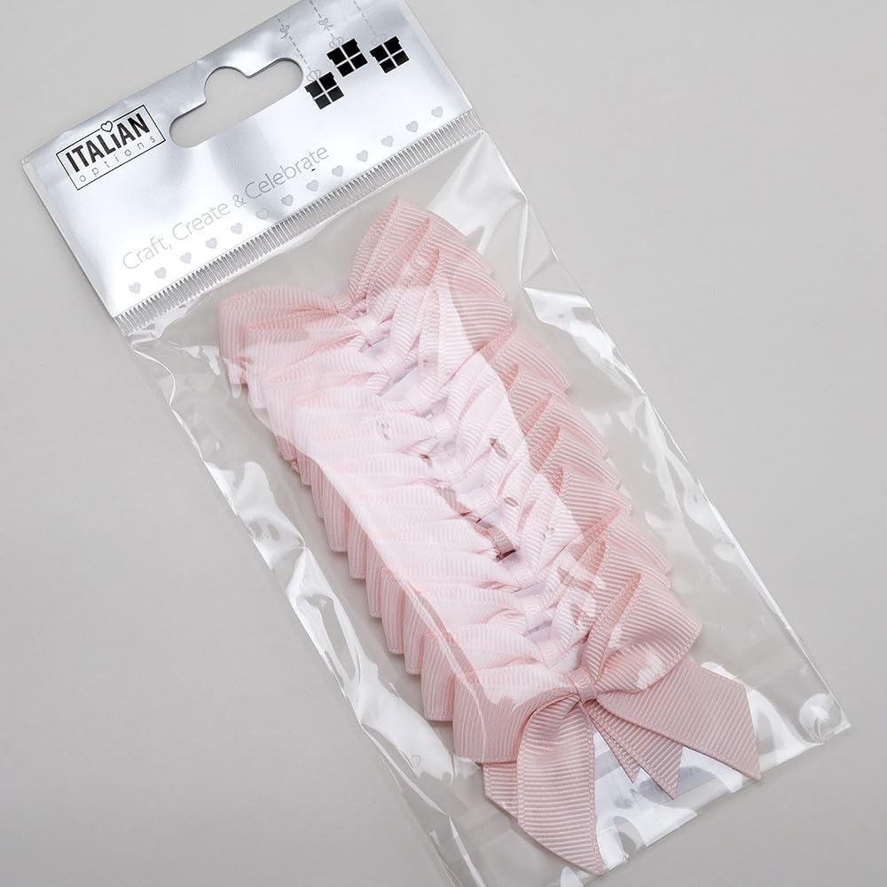 Italian Options Grosgrain Ribbon Bows Self Adhesive 12-Piece Pack. Made from 16 mm, 100% polyester grosgrain ribbon material with a beautiful, soft and delicate ribbed texture. Comes with an easy peel self adhesive backing strip for easy crafting and quick application. The perfect finishing touch to embellish gifts, crafts, invitations, stationery, cards, cake decoration, favour boxes, scented products, cosmetics, candles, wax melts, floristry, confectionery and much more. Measures 5cm in width. Comes in blush pink colour.