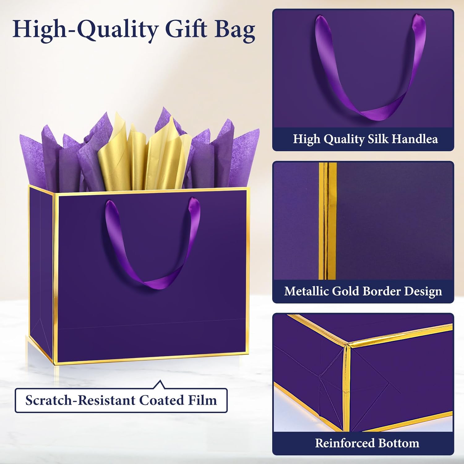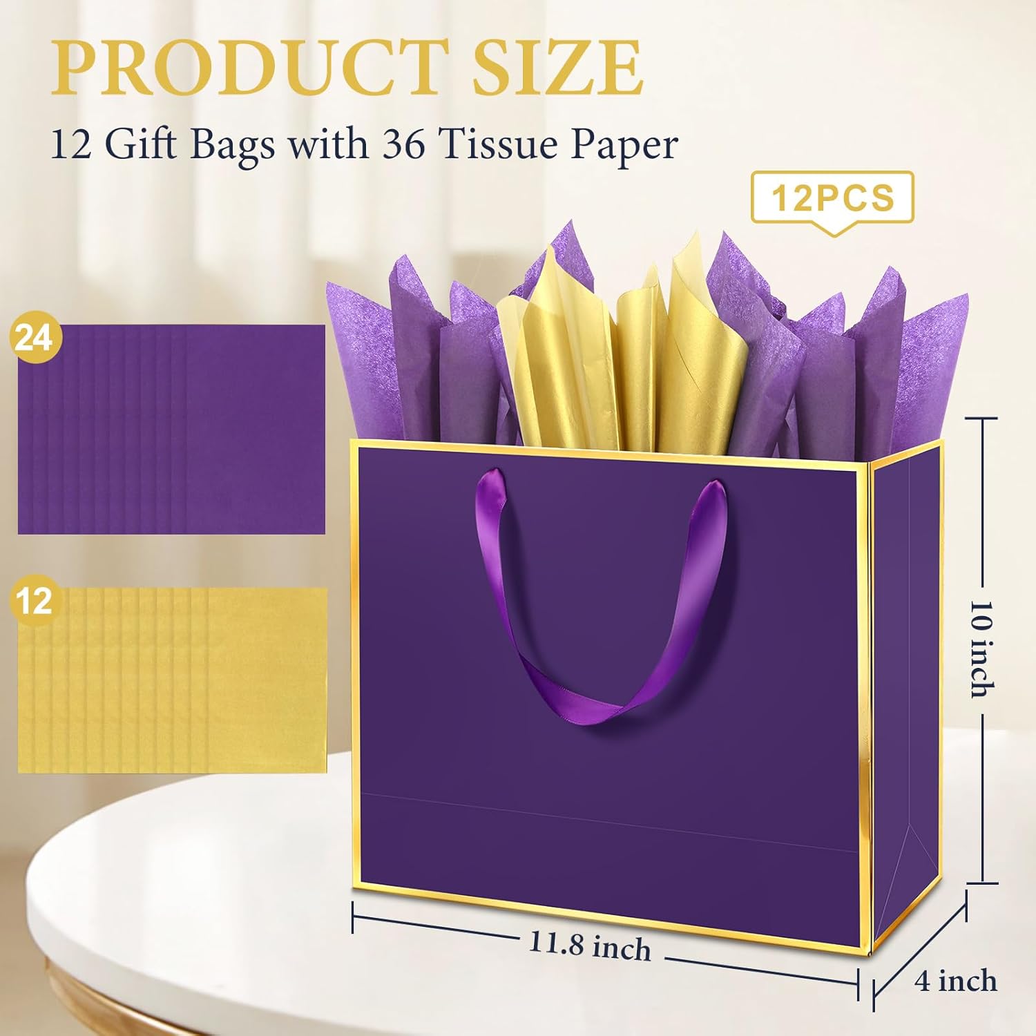 This 12pcs Deluxe Tote Gift Bag Set is designed for exquisite gifting, containing 36 sheets of lightly lined paper, easy to create high-end gift packaging. It is made of sturdy and environmentally friendly 250gsm cardboard, strong load-bearing, not easy to break, with purple base with gold foil trim , simple and elegant, and can be handwritten blessings, suitable for wedding welcome, bridesmaids and groomsmen gifts, birthday parties, baby shower, Valentine's Day, Holiday, Easter, Christmas thanksgiving, or business appreciation, corporate activities and other occasions, it is the preferred choice of you to save your heart and decent gifts.