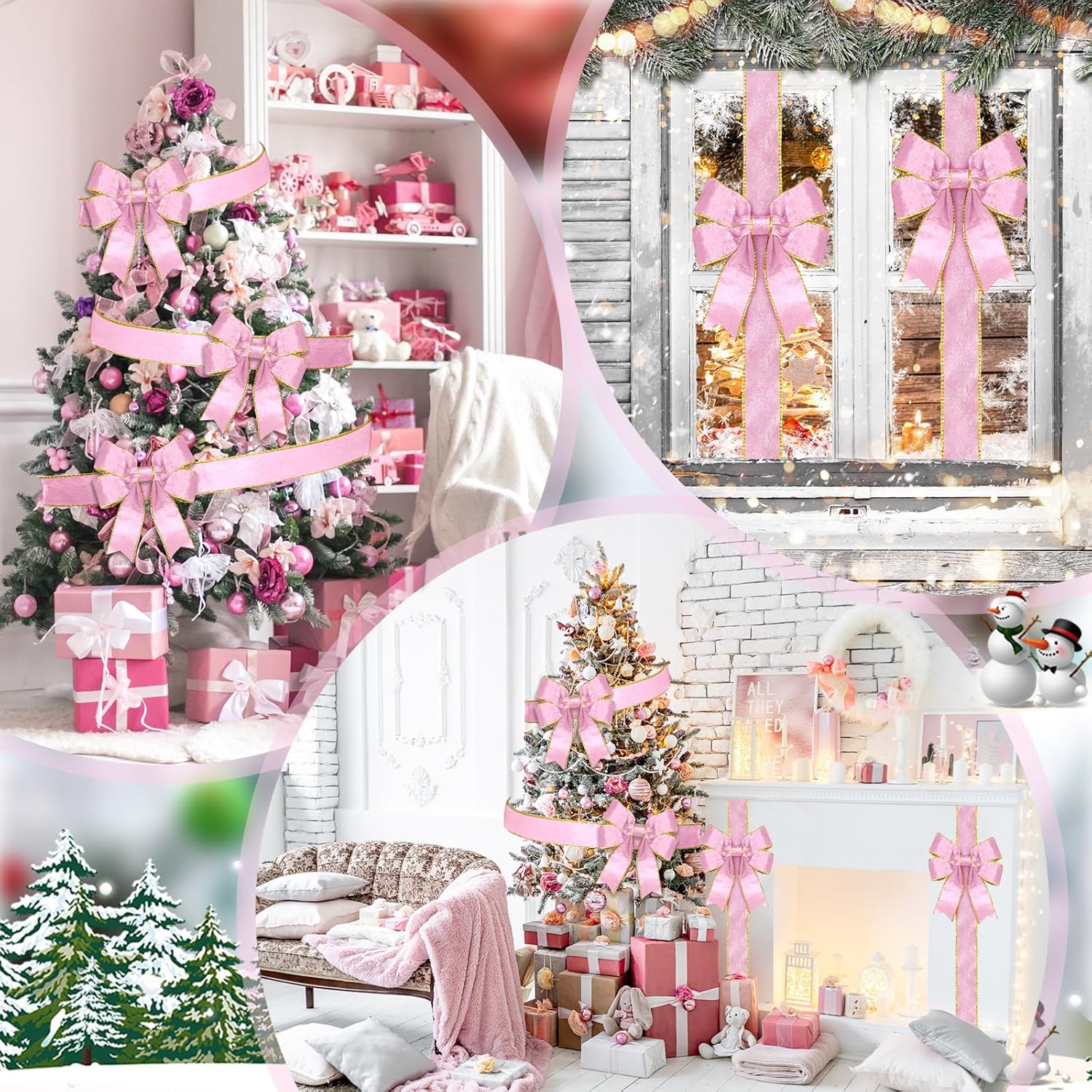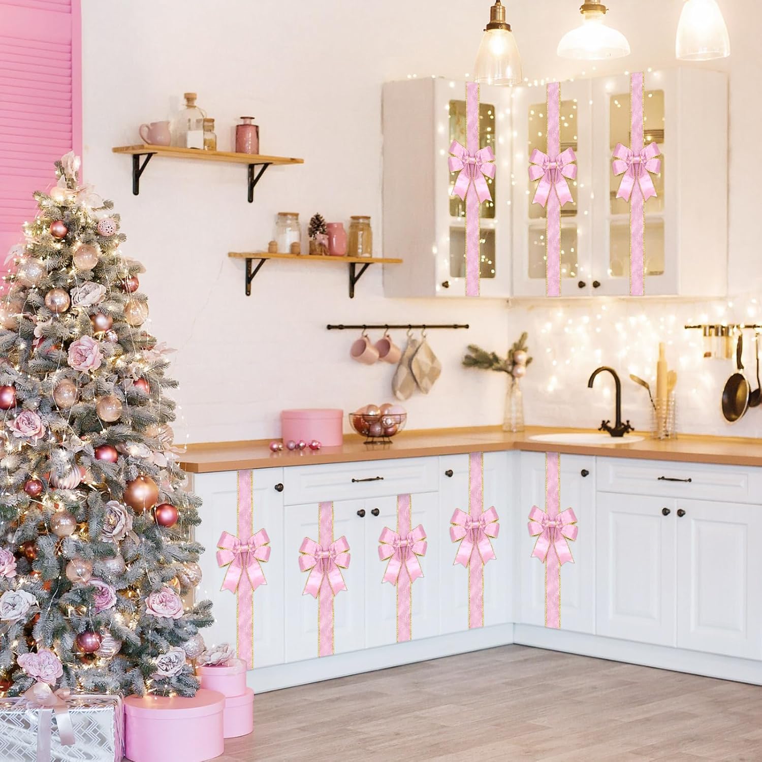 Features: Indoor and Outdoor Decorations: The classic festive color velvet cabinet ribbon bow is good addition for decorating your Christmas. Easy to wrap around cabinet, door, windows, gifts, Christmas tree, fence, wreath, furniture, kitchen and more. Specifications: Material: polyester and velvet Color: pink Size: 78.7" long x 1.97" width Package includes: 15 × Christmas Cabinet Ribbons Bows