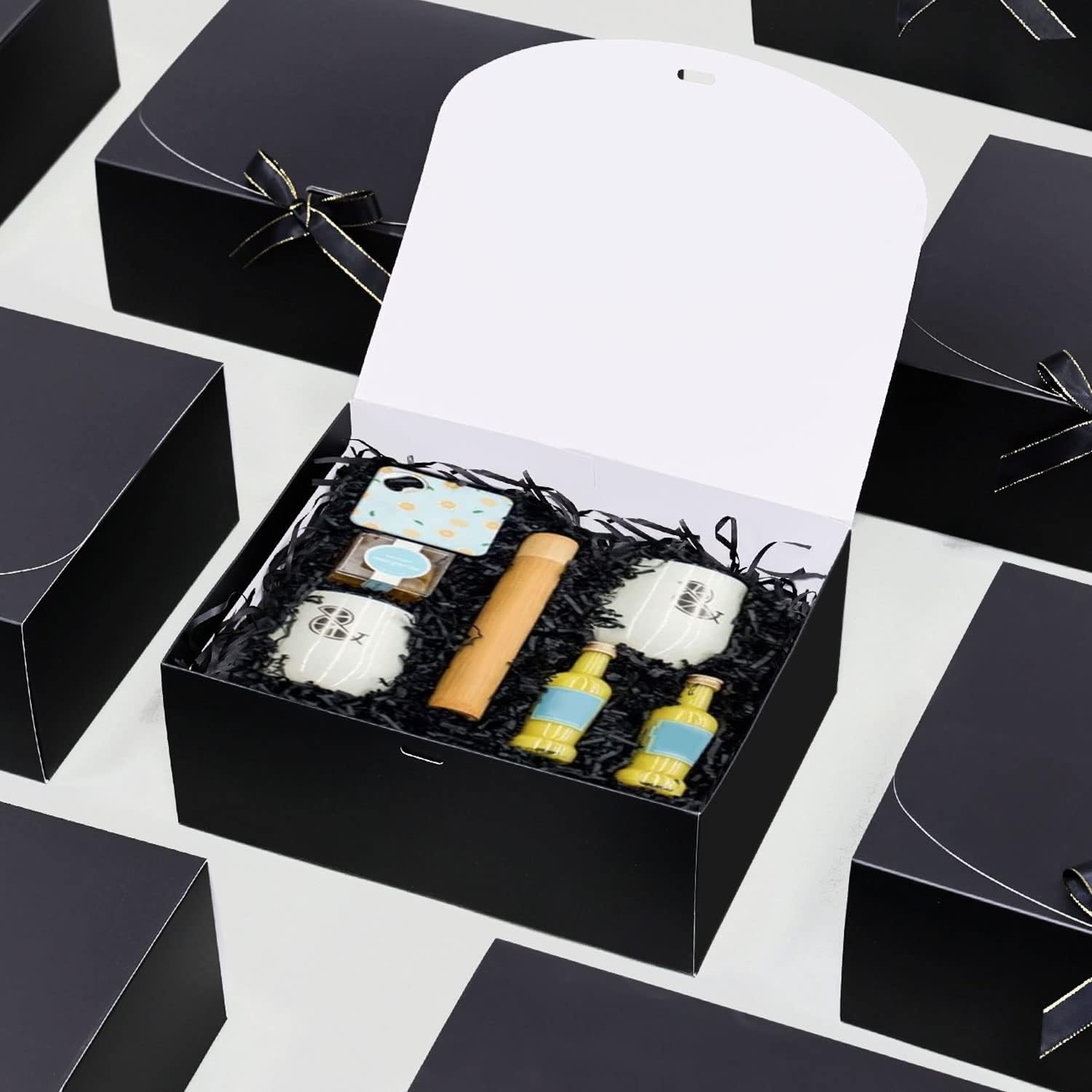 | Included Components | 15 pieces black boxes, 15 pieces greeting cards, 15 pieces black ribbons, 250g/0.55 lb black paper shred filler |
